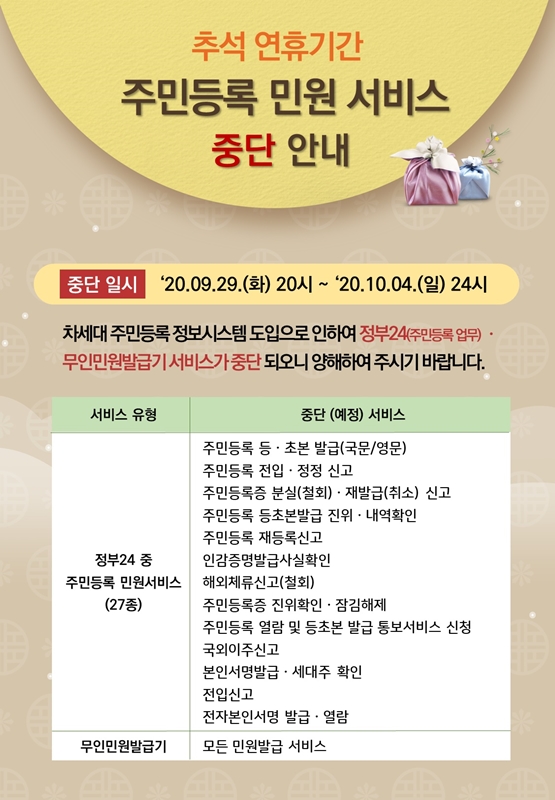 ±ºÀº Ãß¼®¿¬ÈÞ¸¦ Ȱ¿ëÇØ ¸¶Áö¸· Å×½ºÆ®¸¦ ÁøÇàÇÑ µÚ ¿À´Â 10¿ù 5ÀϺÎÅÍ Â÷¼¼´ë Áֹεî·ÏÁ¤º¸½Ã½ºÅÛÀ» °¡µ¿ÇÒ ¹æÄ§ÀÌ´Ù. ÀÌ¿¡ µû¶ó ÀÌ´Þ 29ÀϺÎÅÍ 10¿ù 4ÀϱîÁö Á¤ºÎ24(Áֹεî·Ï¾÷¹«) ¹× ¹«Àιοø¹ß±Þ±â ¼ºñ½º°¡ ÀϽà ÁߴܵȴÙ.