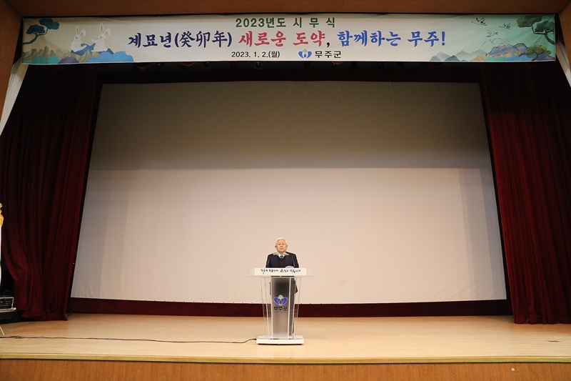 [무주=뉴전북] 황인홍 군수는 새해 첫 일성으로 중력이산(衆力移山 · 많은 사람이 힘을 합치면 태산이라도 옮길 수 있다)을 사용했다. 무주군은 2일 무주예체문화관 1층 대공연장에서 황인홍 군수를 비롯해 군 산하 전 공직자가 참석한 가운데 시무식을 갖고 새해 첫 업무에 돌입했다.