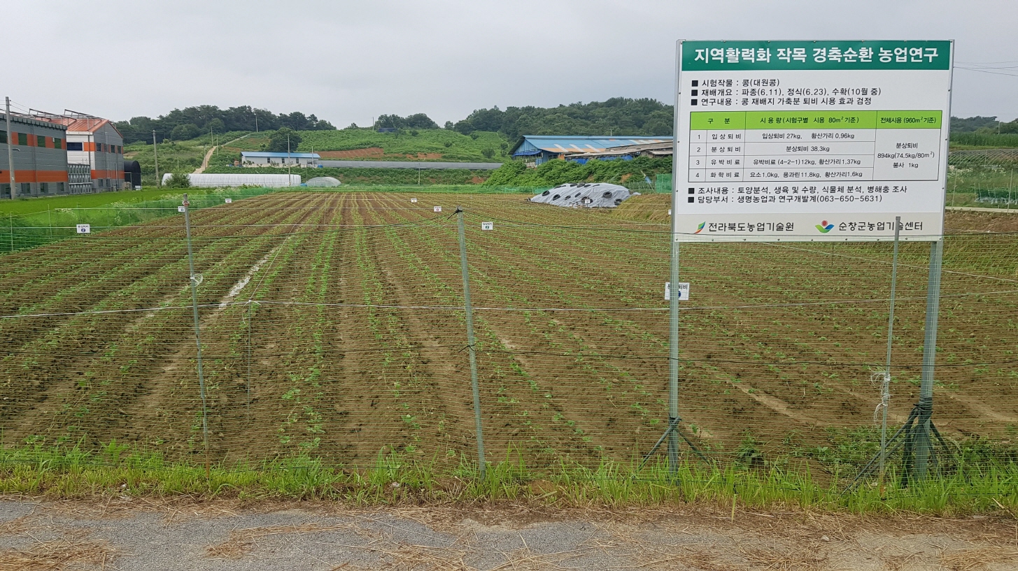 [순창=뉴전북] 전북 순창군농업기술센터는 과잉생산되는 가축분퇴비의 소비 확대를 위해 지난 2년간 전라북도농업기술원과 경축순환 농업연구를 공동으로 추진하고 연구결과를 활용한 장류콩 재배 매뉴얼을 보급한다고 밝혔다.