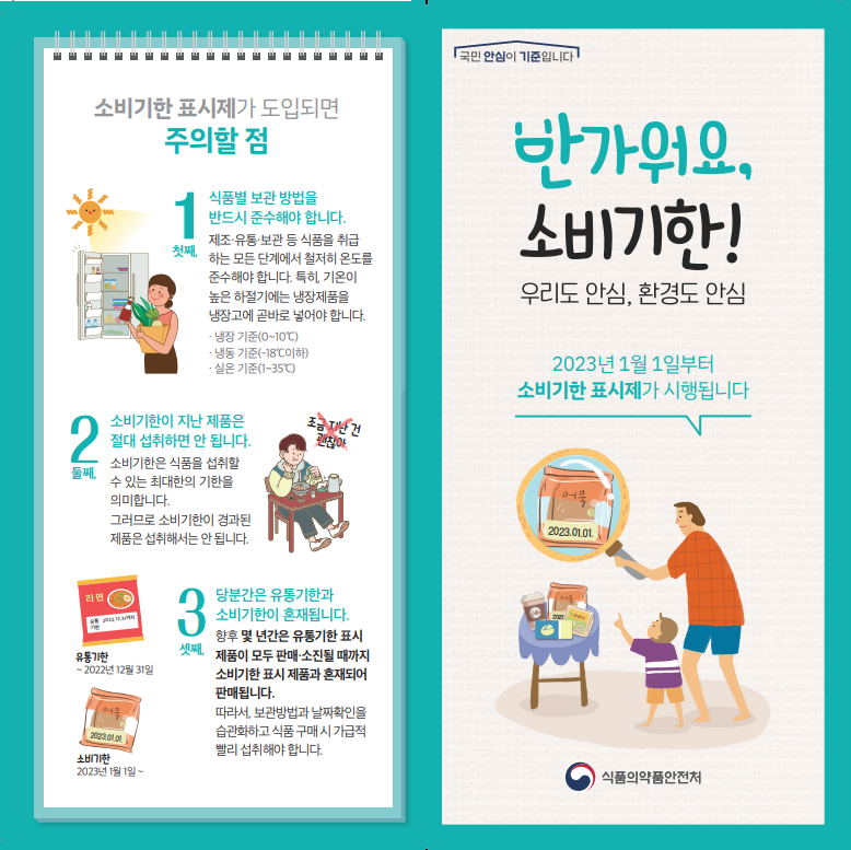 소비기한 제도는 올해 계도기간이 운영돼 날짜 표기가 유통기한과 소비기한 모두 표시되며, 이에 따라 판매된 식품의 날짜 표기가 유통기한인지, 소비기한인지를 잘 확인한 후 기한 내에 섭취해야 한다.