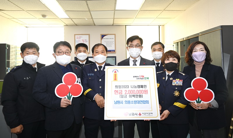 [남원=뉴전북] 남원의용소방대연합회는 19일 남원시를 방문하여 희망2023 나눔캠페인을 맞이해 이웃돕기 성금 200만원을 전달했다.