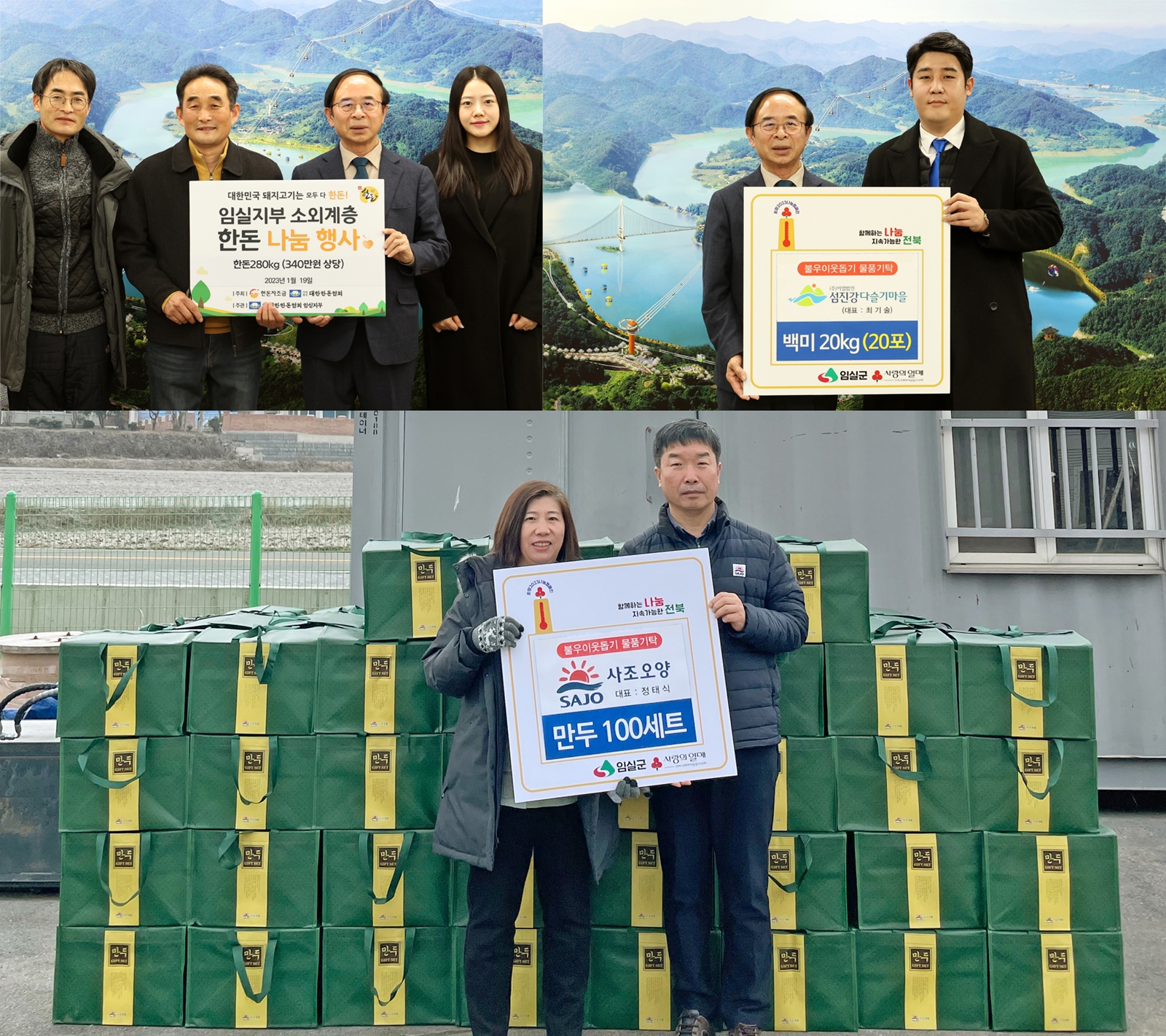 • (사)대한한돈협회 임실군지부 한돈 280kg, ㈜사조오양 만두 100세트, ㈜섬진강다슬기마을 백미 20kg 20포,한국치즈과학고등학교 276,000원, 임실원광어린이집 428,000원