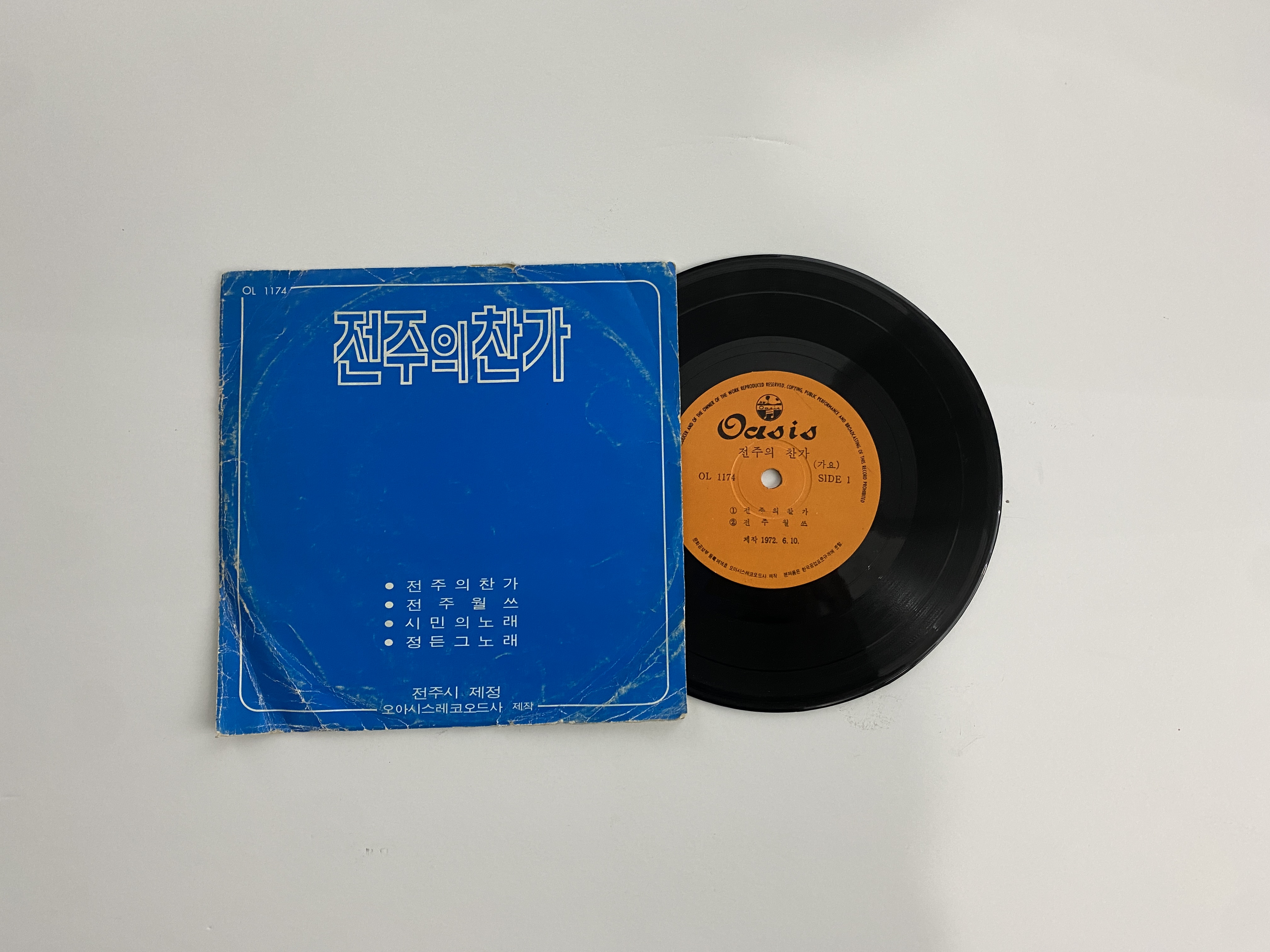 1972년 6월 제작된 ‘전주의 찬가’는 흥겨운 민요풍의 노래로 완산칠봉, 덕진연못, 풍남문, 오목대 등에 스며드는 봄을 통해 전주에 대한 사랑을 표현한 곡이다. 앞면(사이드 1)에는 ‘전주의 찬가’와 ‘전주 월쓰’(왈츠의 당시 표기)가, 뒷면(사이드 2)에는 ‘전주 시민의 노래’와 ‘정든 그 노래’가 실려 있으며, 겉표지와 속지, 레코드판까지 전체적으로 보존 상태가 매우 좋다.