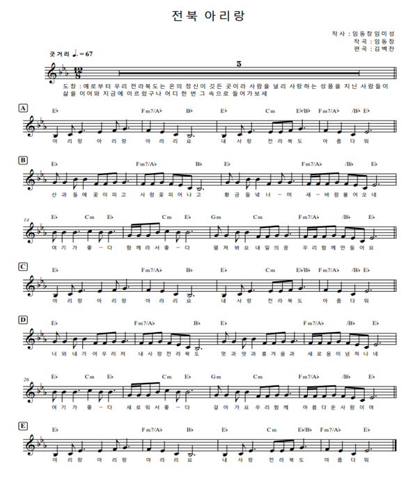• -민요 ‘아리랑’ 전통적 선율 바탕으로 전북의 미래상 반영 -아리랑 재해석 통해 전북의 새로운 미래와 꿈을 만들어가자는 의지 표명 -‘국악의 본고장’ 답게 광역지자체 최초 국악 활용 제…