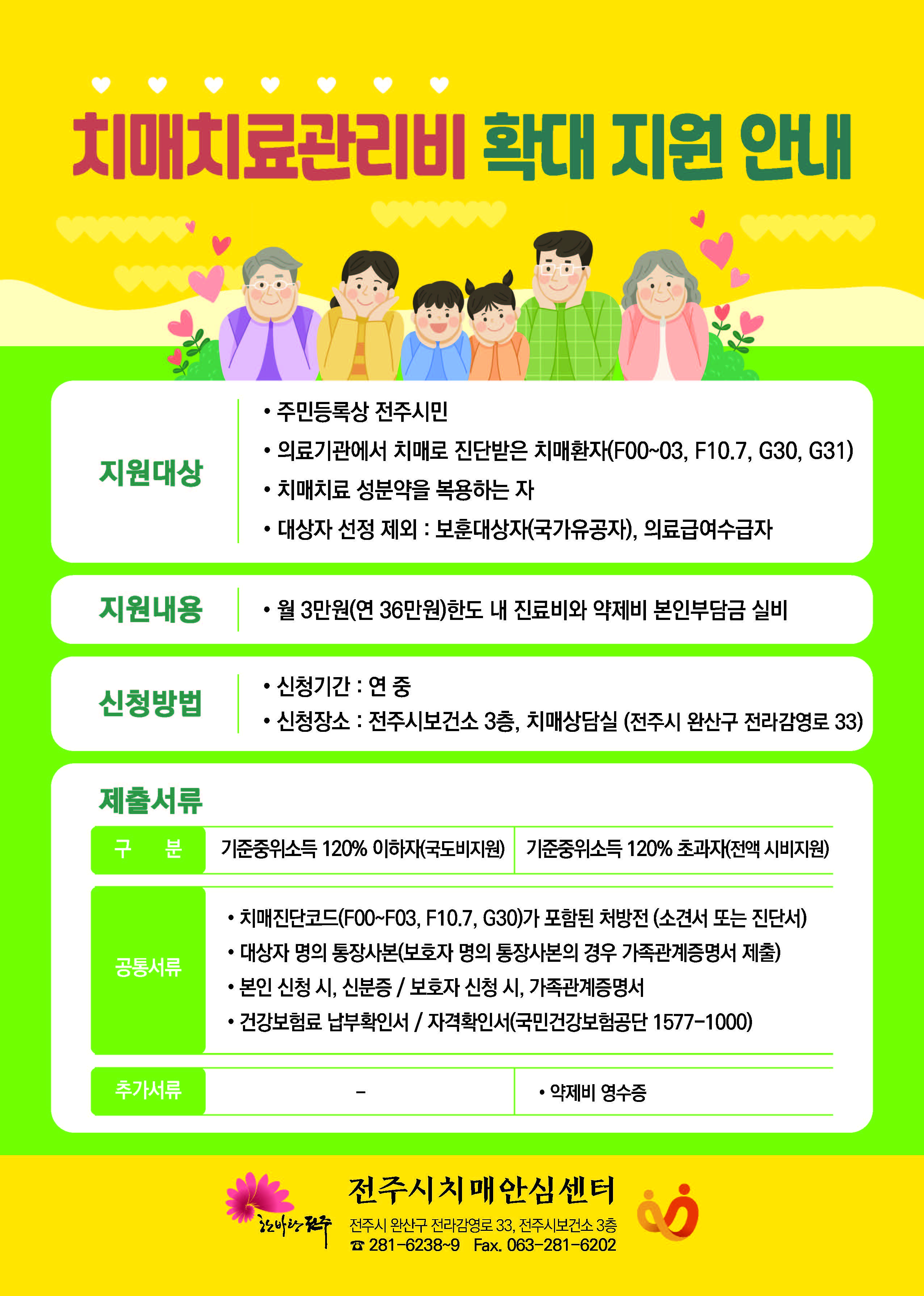 김신선 전주시보건소장은 “치매치료관리비 확대 지원 사업을 통해 치매 치료의 경제적 부담을 완화해 치매환자가 조기에 적절한 치료를 받을 수 있을 것”이라며 “대상자 욕구에 기반한 실질적 지원 방안을 마련해 전주시 모든 대상자들이 행복한 치매안심사회를 실현하도록 노력하겠다”고 말했다.