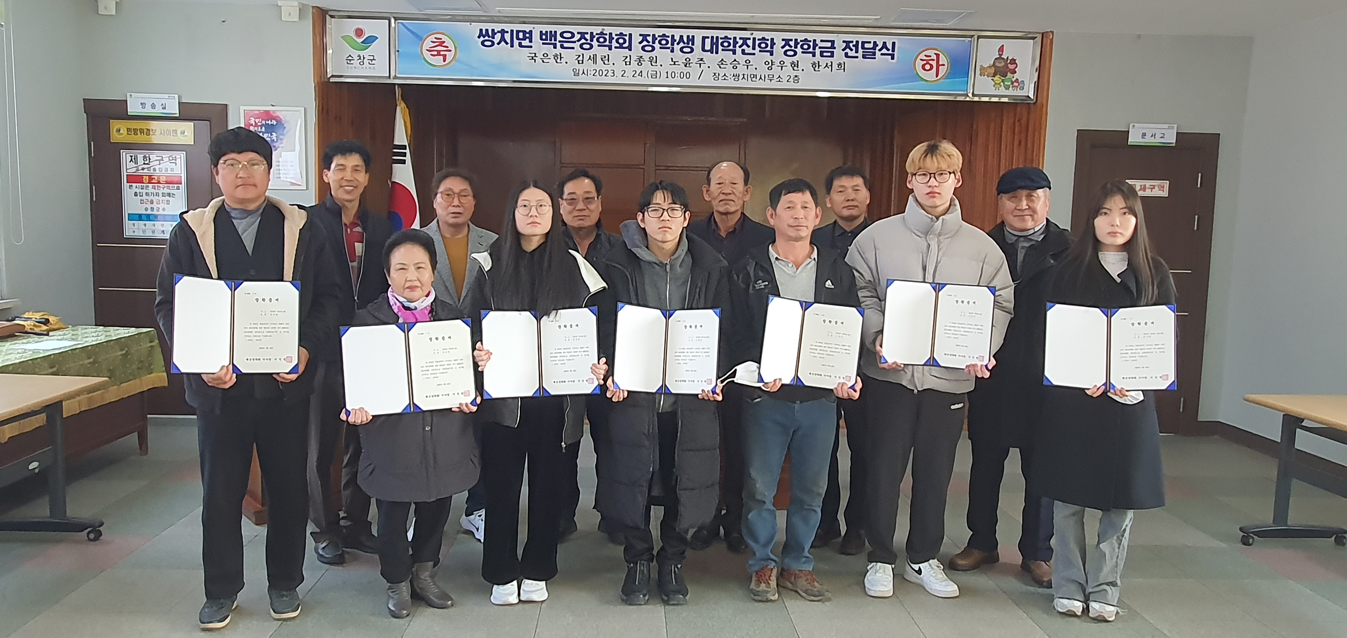 [순창=뉴전북] 쌍치면 백은장학회(이사장 이인범)는 지난 24일 관내 초․중학교 졸업 후 대학에 입학하는 신입생 7명에게 총 1,400만 원의 장학금을 전달했다고 밝혔다.
