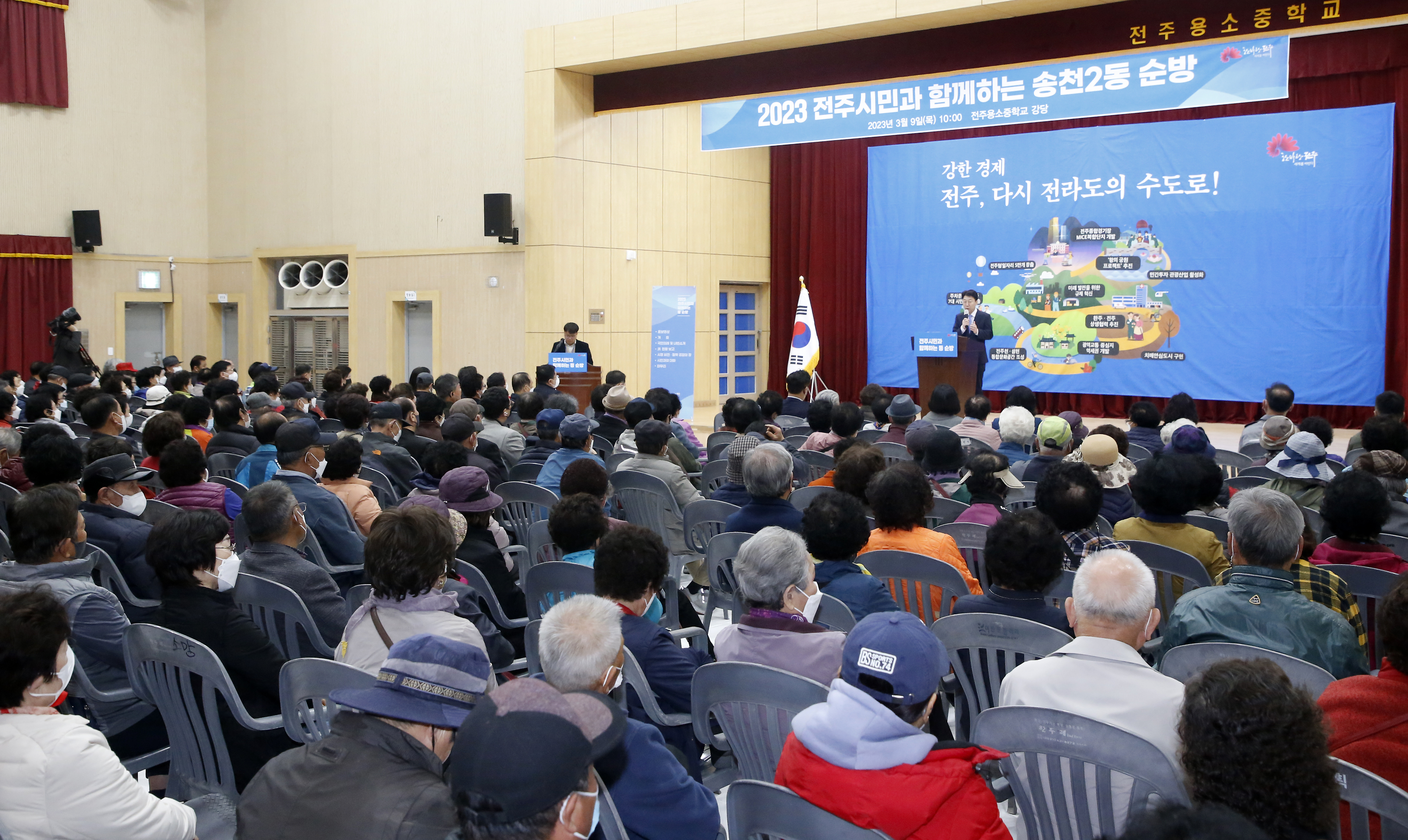 우범기 시장은 9일 전주용소중학교 강당에서 송천2동 주민과 시의원, 자생단체회원, 유관기관 대표 등 300여 명이 참석한 가운데 ‘2023년 시민과 함께하는 동 순방’을 실시했다.