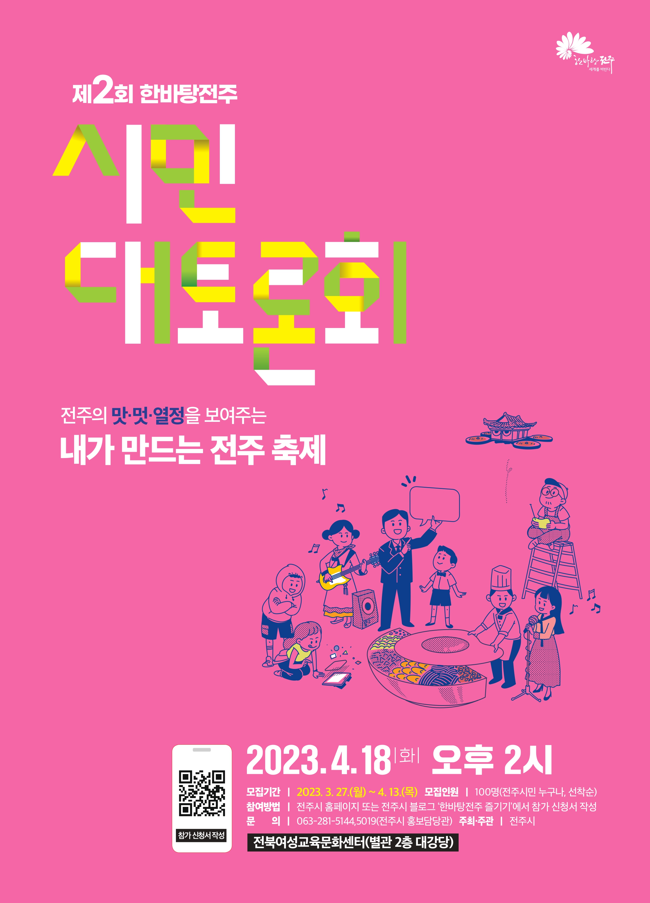 시는 오는 4월 18일 오후 2시, 전북여성교육문화센터 별관 대강당에서 ‘전주의 맛·멋·열정을 보여주는, 내가 만드는 전주 축제’를 주제로 ‘제2회 한바탕전주 시민대토론회’를 개최한다.