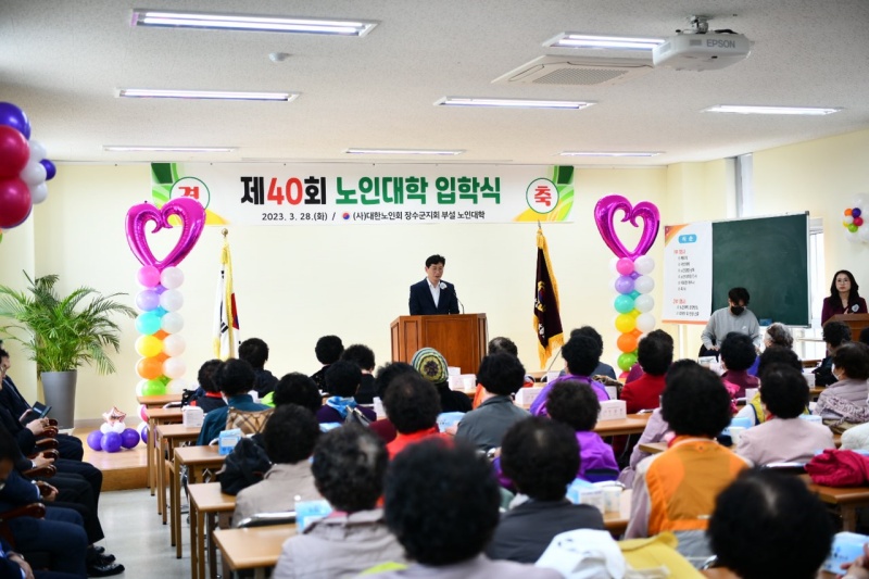 [장수=뉴전북](사)대한노인회 장수군지회 부설 노인대학(학장 홍봉길)은 28일 입학생 및 내‧외빈 등 120여 명이 참석한 가운데 제40회 노인대학 입학식을 개최했다.