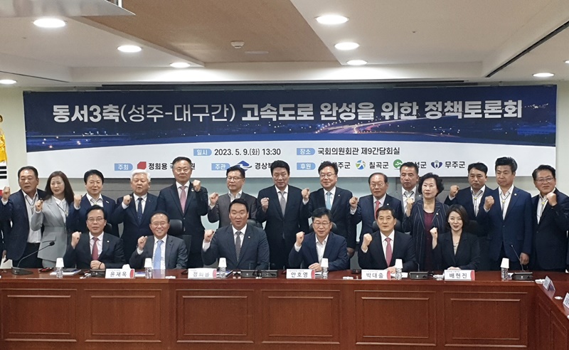 지난 9일 국회 제9간담회실에서는 동서 3축 무주~성주~대구간 고속도로 완성을 위한 정책토론회가 열렸으며 이 자리에는 토론회를 주관한 경상북도 이철우 도지사를 비롯한 황인홍 무주군수와 이병환 성주군수, 김재욱 칠곡군수, 최재훈 달성군수가 함께 했다.