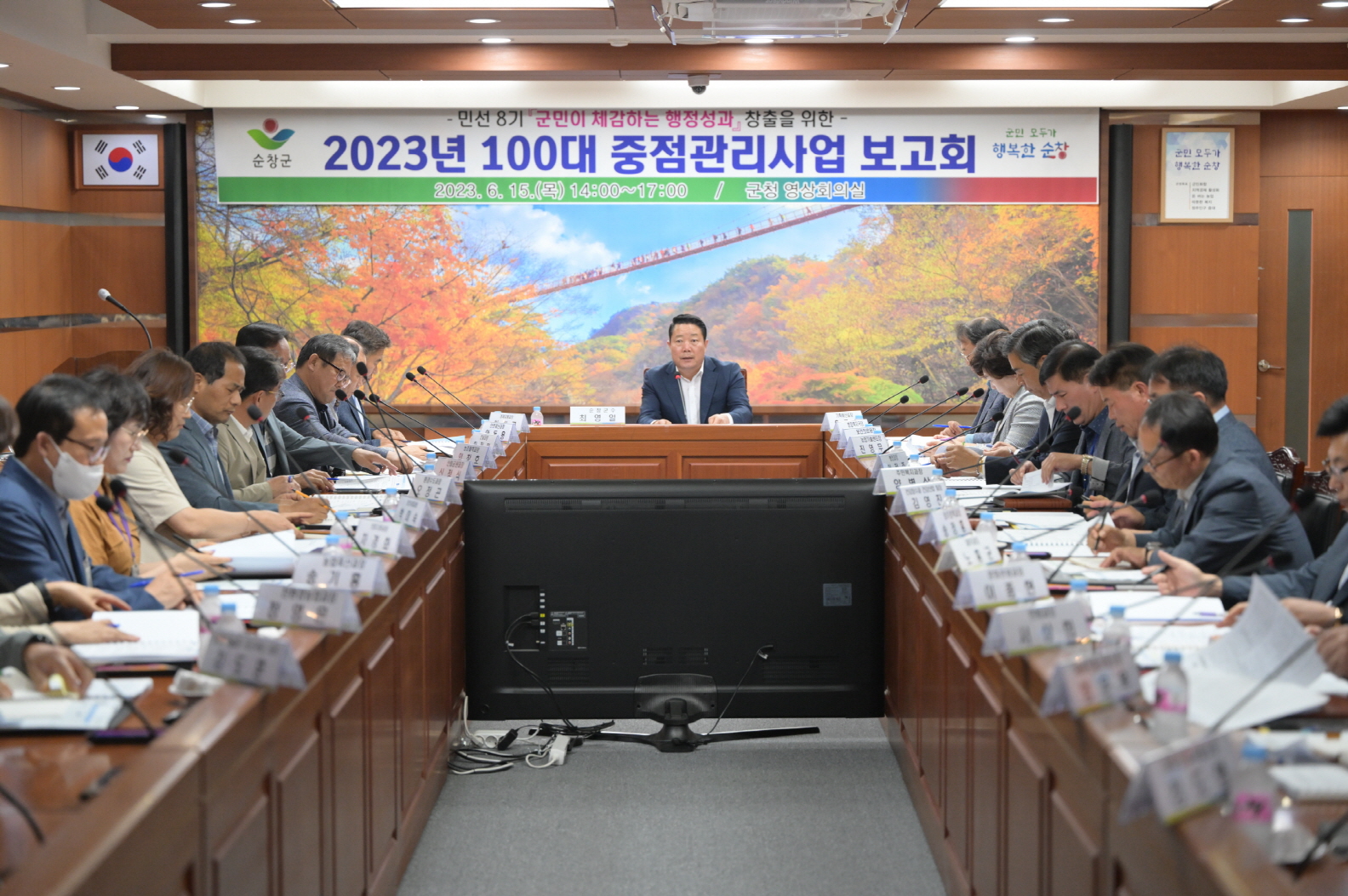 [순창=뉴전북] 전북 순창군이 15일 군청 영상회의실에서 올해 군정 핵심현안을 재점검하고 속도감 있는 군정성과 창출을 위한 ‘100대 중점관리사업 보고회’를 개최했다고 밝혔다.