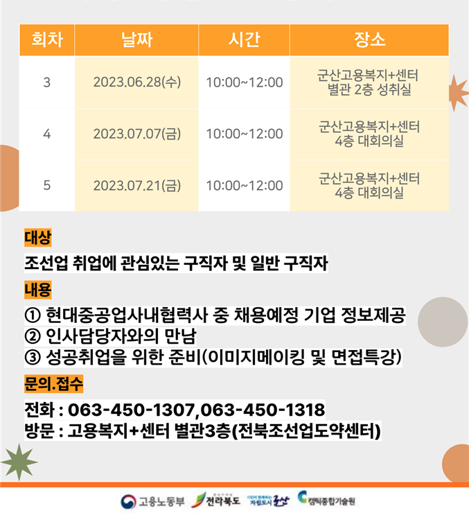 이번 프로그램은 오는 21일 각각 오전 10시부터 12시까지 조선업에 관심이 있는 구직자 전체를 대상으로 군산고용복지플러스센터 4층 대강당에서 2회 운영된다.