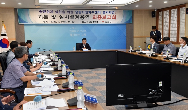 [김제=뉴전북] 김제시는 지난 11일 2층 상황실에서 자원순환 실현을 위한 생활자원회수센터 설치사업 기본 및 실시설계용역 최종보고회를 개최했다고 밝혔다.