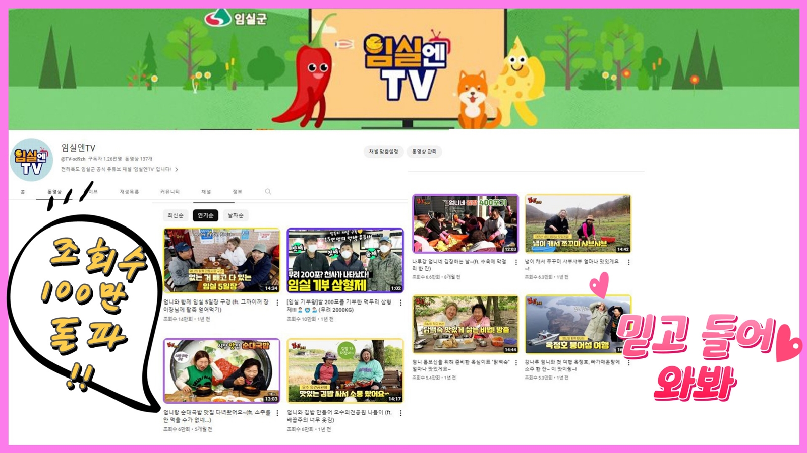 특히 지난해 선보인 유튜브 임실엔 TV의 핫한 콘텐츠인 ‘엄니! 같이 가’의 인기에 힘입어 조회수가 100만을 돌파하며 그 위력을 발휘하고 있다.