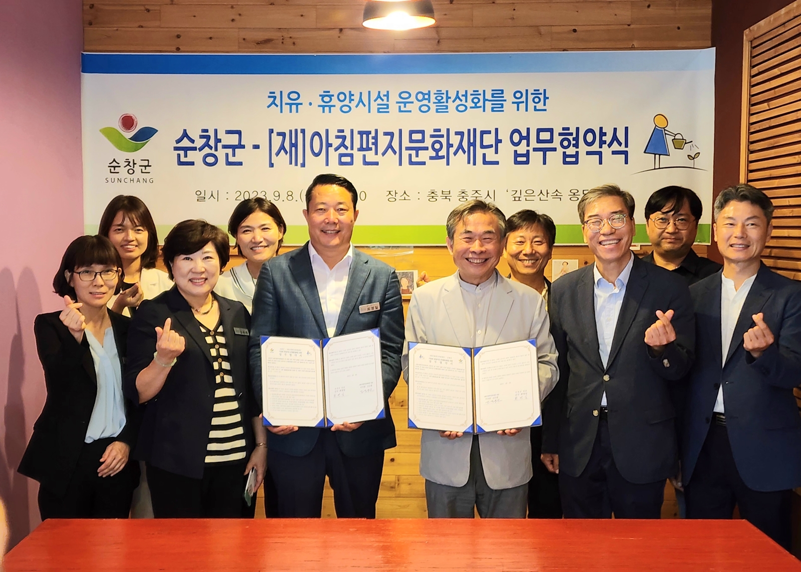 [순창=뉴전북] 전북 순창군(최영일 군수)과 (재)아침편지문화재단(고도원 이사장)은 충북 충주시에 위치한 ‘깊은 산속 옹달샘’에서 양 기관의 치유 및 휴양시설 활성화를 위해 두 손을 맞잡았다
