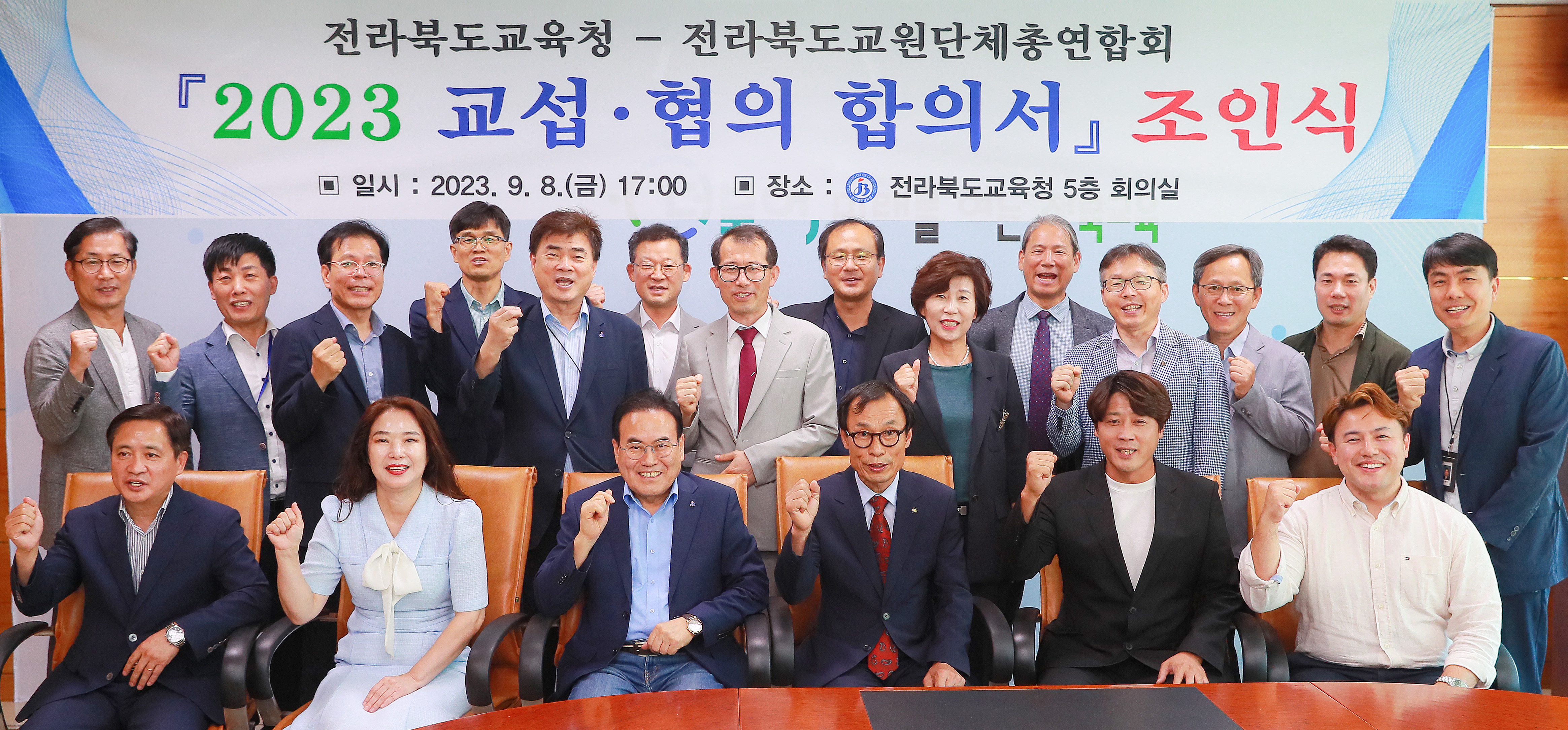 [교육=뉴전북] 전라북도교육청(교육감 서거석)과 전라북도교원단체총연합회(회장 이기종)는 지난 8일 도교육청 5층 회의실에서 ‘2023 교섭·협의 합의서 조인식’을 가졌다.