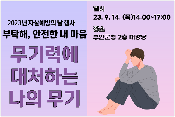 [부안=뉴전북] 부안군은 세계자살예방의 날을 맞아 오는 14일 오후2시 군청 2층 대강당에서 자살예방 행사 ‘부탁해, 안전한 내마음’을 개최한다.