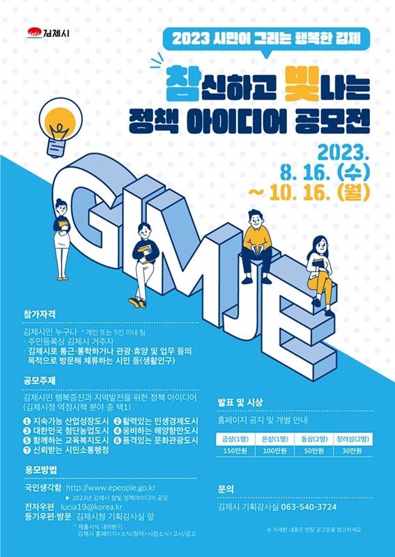 공모 주제는 ‘김제시민 행복증진과 지역발전을 위한 정책 아이디어’이다.