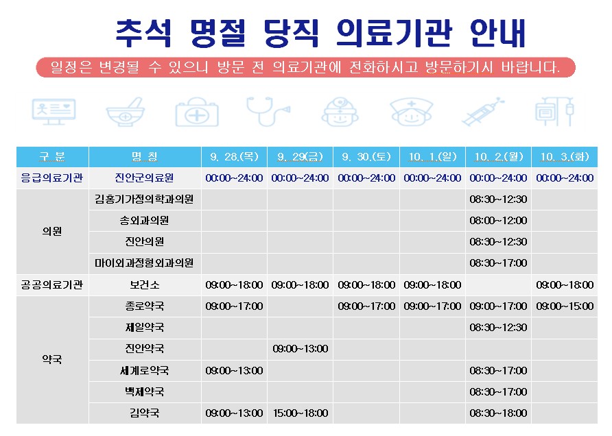 연휴기간 중 운영하는 의료기관 및 약국 정보는 진안군청 홈페이지 공지사항, 응급의료포털(www.e-gen.or.kr), 응급의료정보제공 앱(App)에서 확인할 수 있으며 진안군보건소(☎063-430-8561)로 문의할 수 있다.