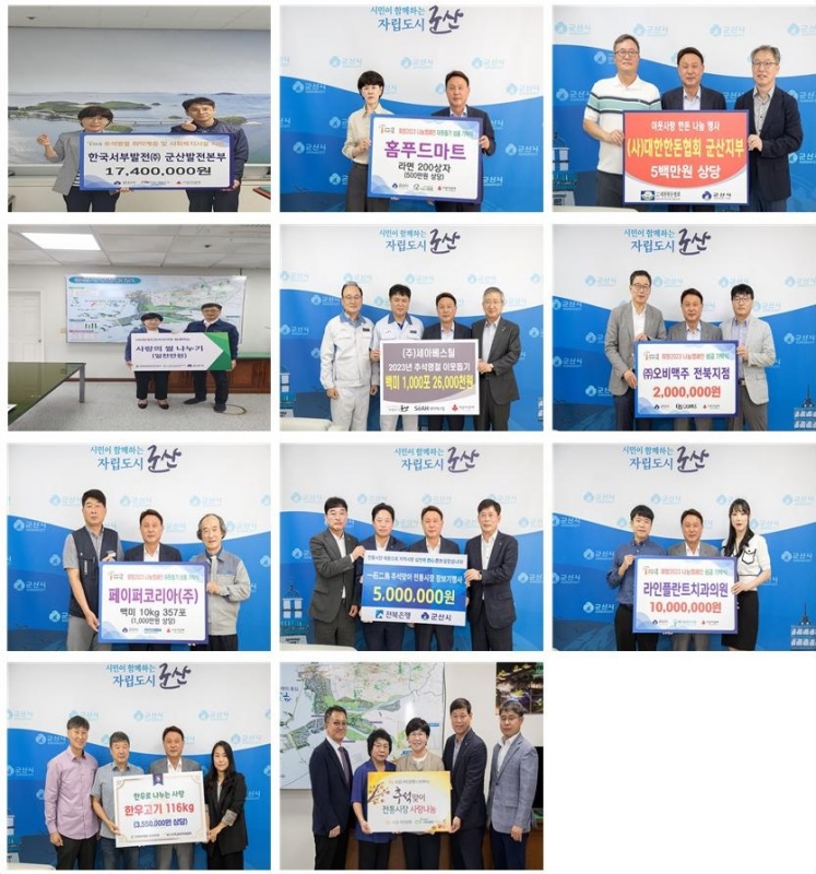 군산시에 따르면 올 추석을 맞아 각 읍면동 행정복지센터에 5천 6백여만 원, 세아베스틸, 페이퍼 코리아, 한국서부발전 군산발전본부 등 14개 기업 및 단체에서 1억 2천여만 원, 시 간부 공무원과 시 지정기탁금 등으로 4천 4백여만 원의 성금·품이 전달됐다.