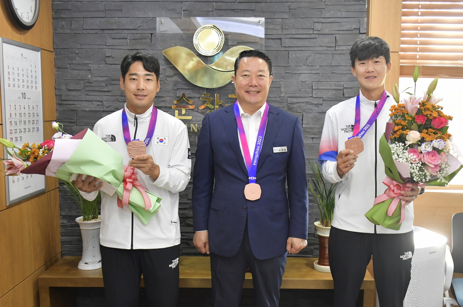 [순창=뉴전북] 최영일 순창군수는 11일 군수실에서 중국 항저우에서 열린 ‘제19회 아시안게임 소프트테니스’ 종목에서 우수한 성적을 거둔 순창군청 소속 윤형욱·김병국 선수를 격려하는 시간을 가졌다.