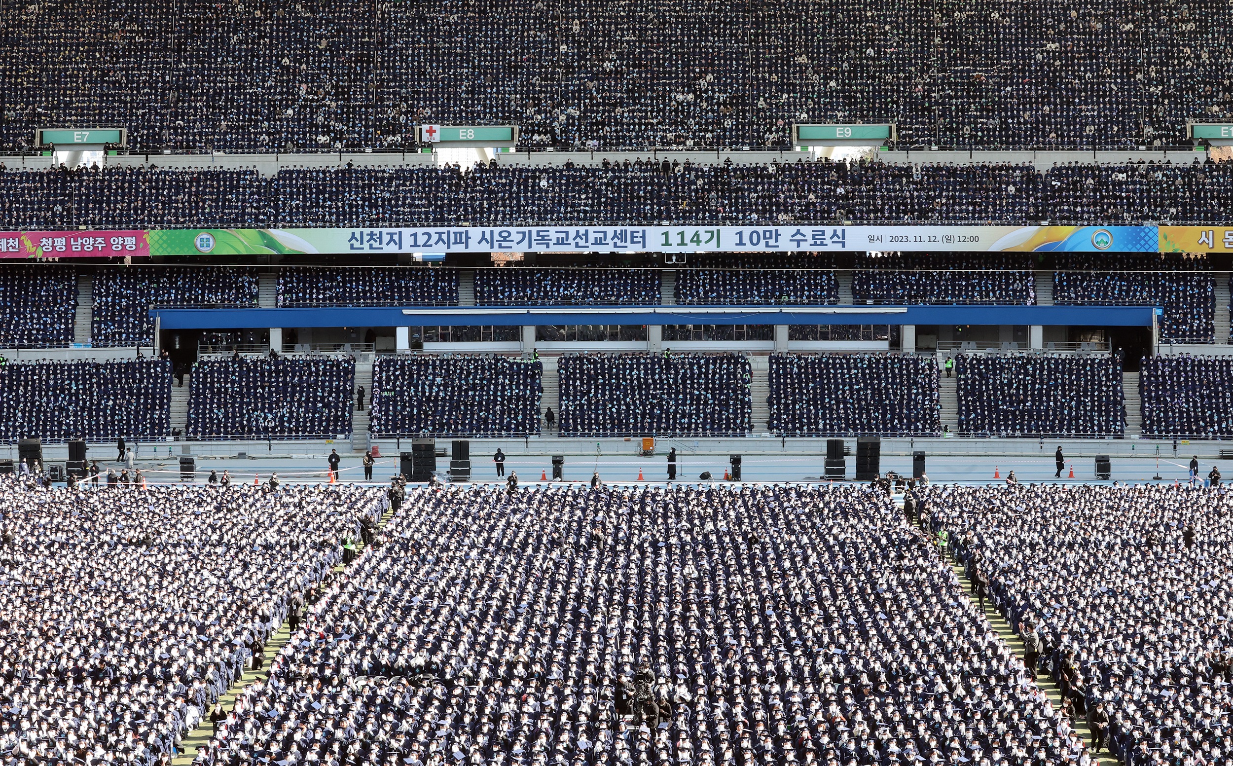신천지예수교회의 성경교육기관인 시온기독교선교센터(총원장 탄영진)는 이날 대구스타디움에서 ‘신천지 12지파 시온기독교선교센터 114기 수료식’을 개최했다. 이번 10만 수료식에서 배출한 수료생은 총 10만 8084명이다. 2019년 10만 3764명, 2022년 10만 6186명에 이어 세 번째 10만 명 이상 수료생을 배출한 것이다.