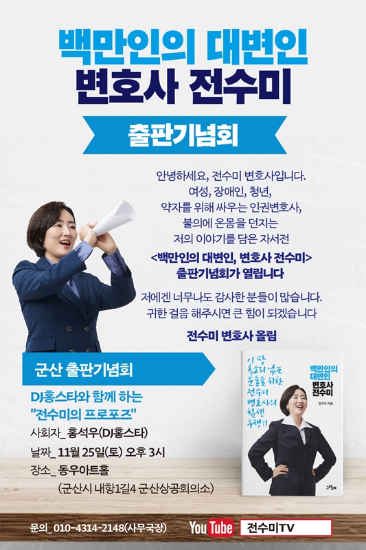 [군산=뉴전북] 내년 총선 전북 군산선거구 출마 예정으로 알려진 전수미 변호사가 오는 25일 오후 3시 군산시 장미동 동우아트홀(군산상공회의소 2층)에서 ‘백만인의 대변인, 변호사 전수미’ 출판기념회를 연다고 밝혔다.
