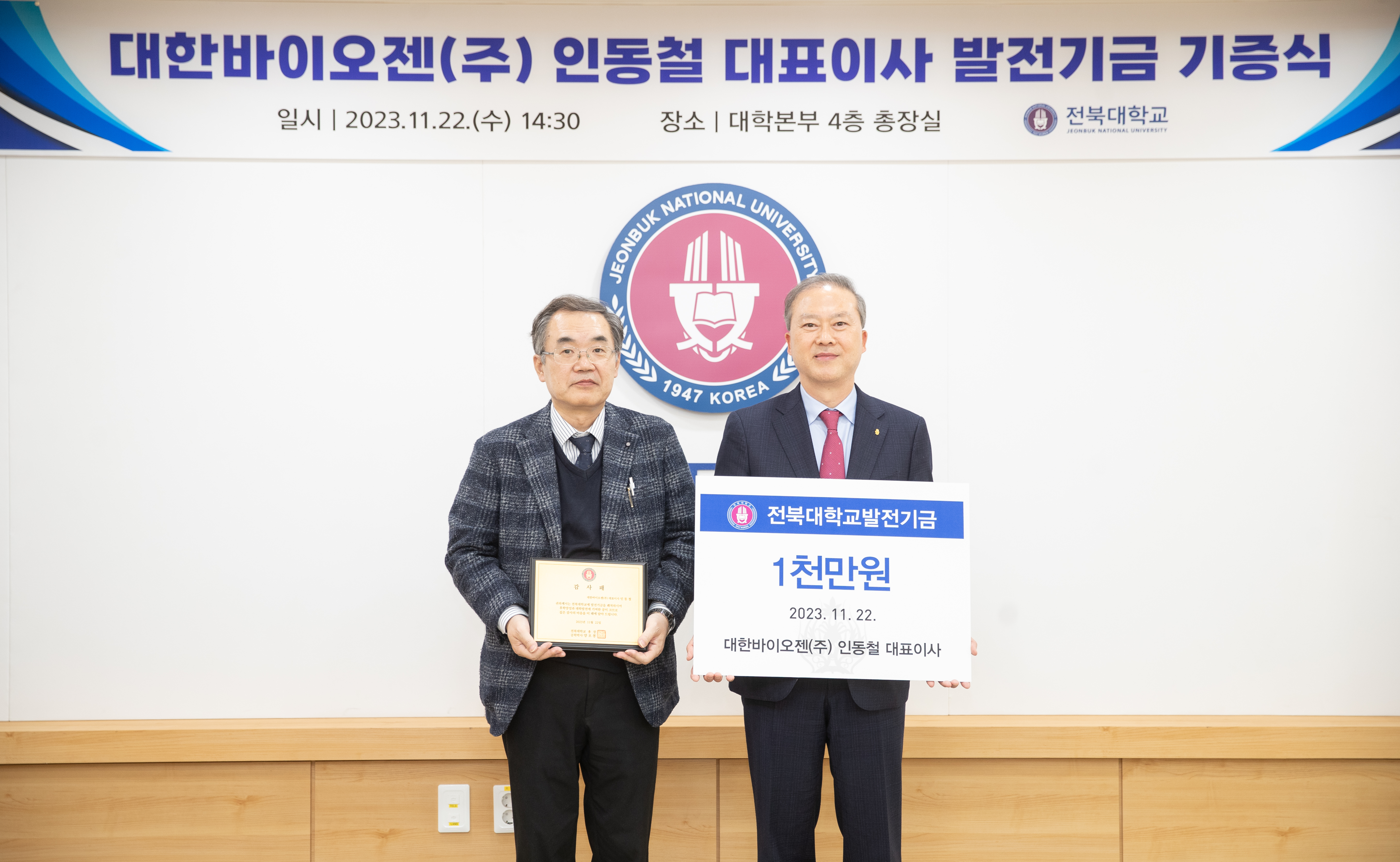 전북대 발전지원재단은 11월 22일 대학본부 총장실에서 양오봉 총장과 대학 주요 관계자들이 참석한 가운데 발전기금 기증식을 열고 감사패를 전달했다.