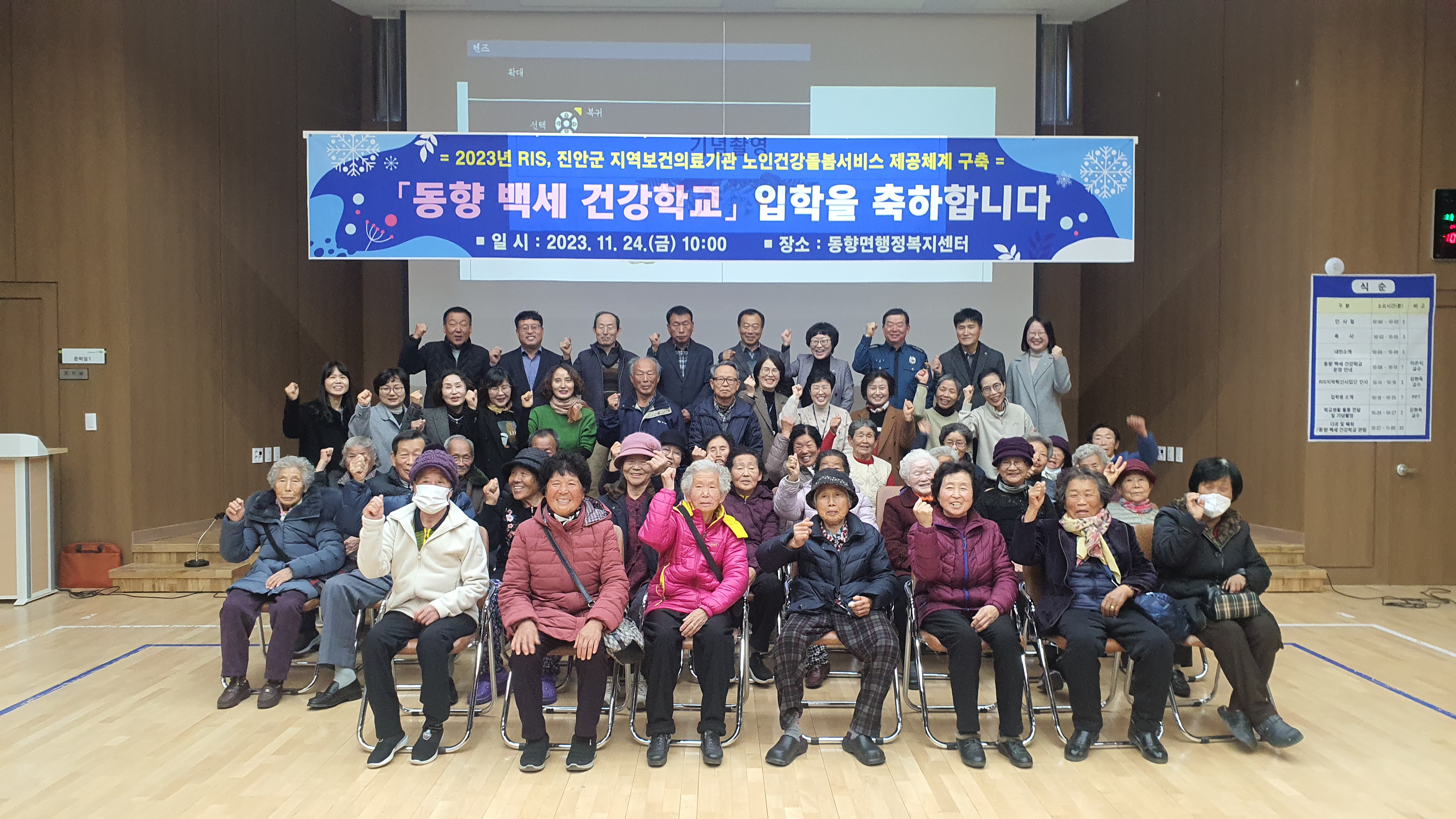[진안=뉴전북]진안군은 24일 ‘백세 건강학교’를 개설하고 동향면 행정복지센터에서 입학생 등 지역주민 100여명과 입학식을 가졌다.