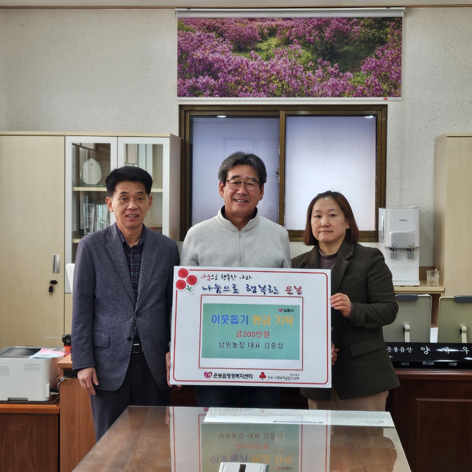 [남원=뉴전북] 남원시 운봉읍 남원농장 대표 김종성씨는 지난 5일 운봉읍행정센터를 방문하여 어려운 이웃을 위해 성금 200만원의 성금을 기탁하였다.