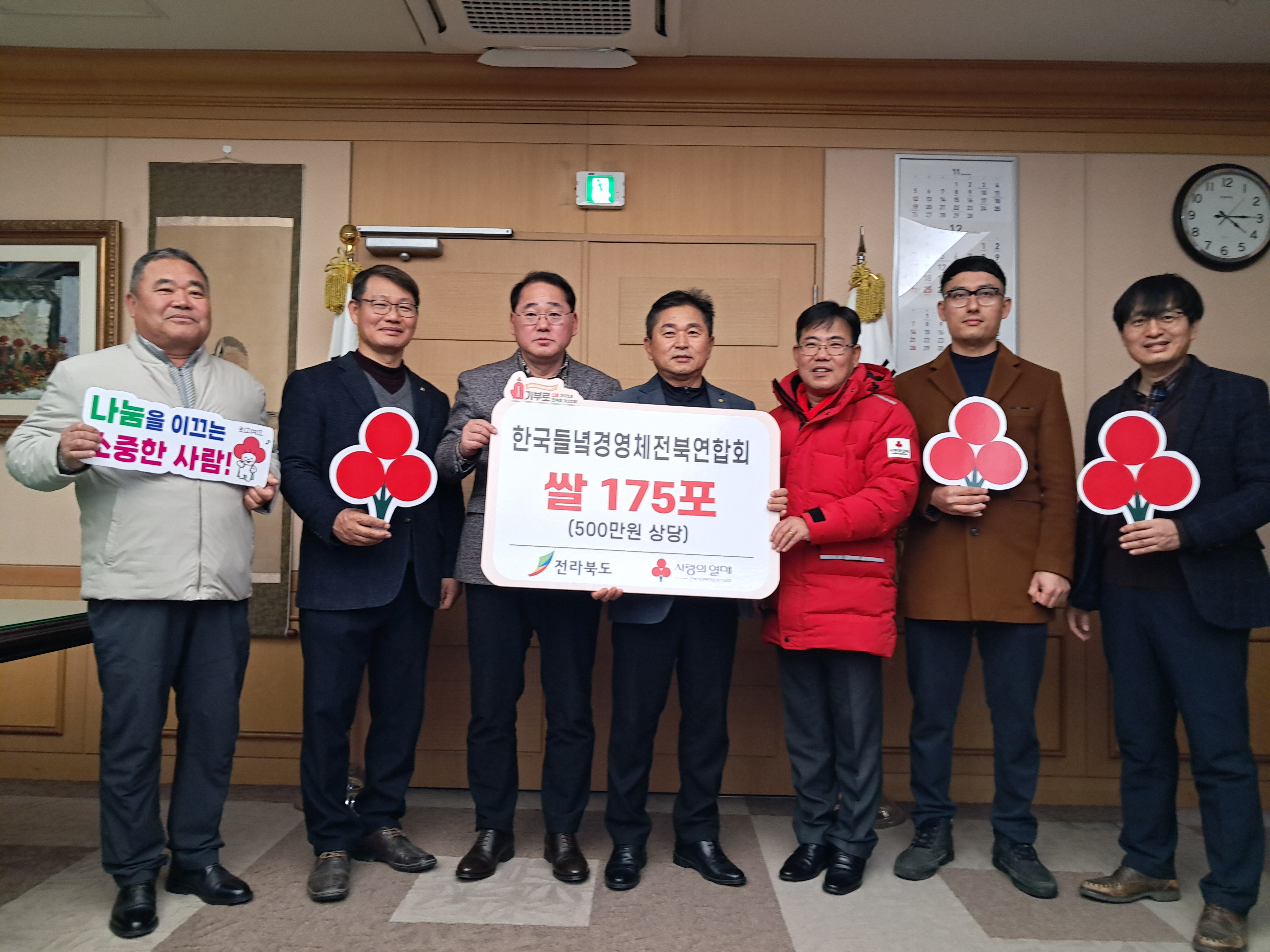 [경제=뉴전북] ()한국들녘경영체 전북연합회(회장 김대식)가 연말연시를 맞아 어려움을 겪고 있는 취약계층을 위해 500만원 상당의 쌀(백미) 175포를 기탁했다.