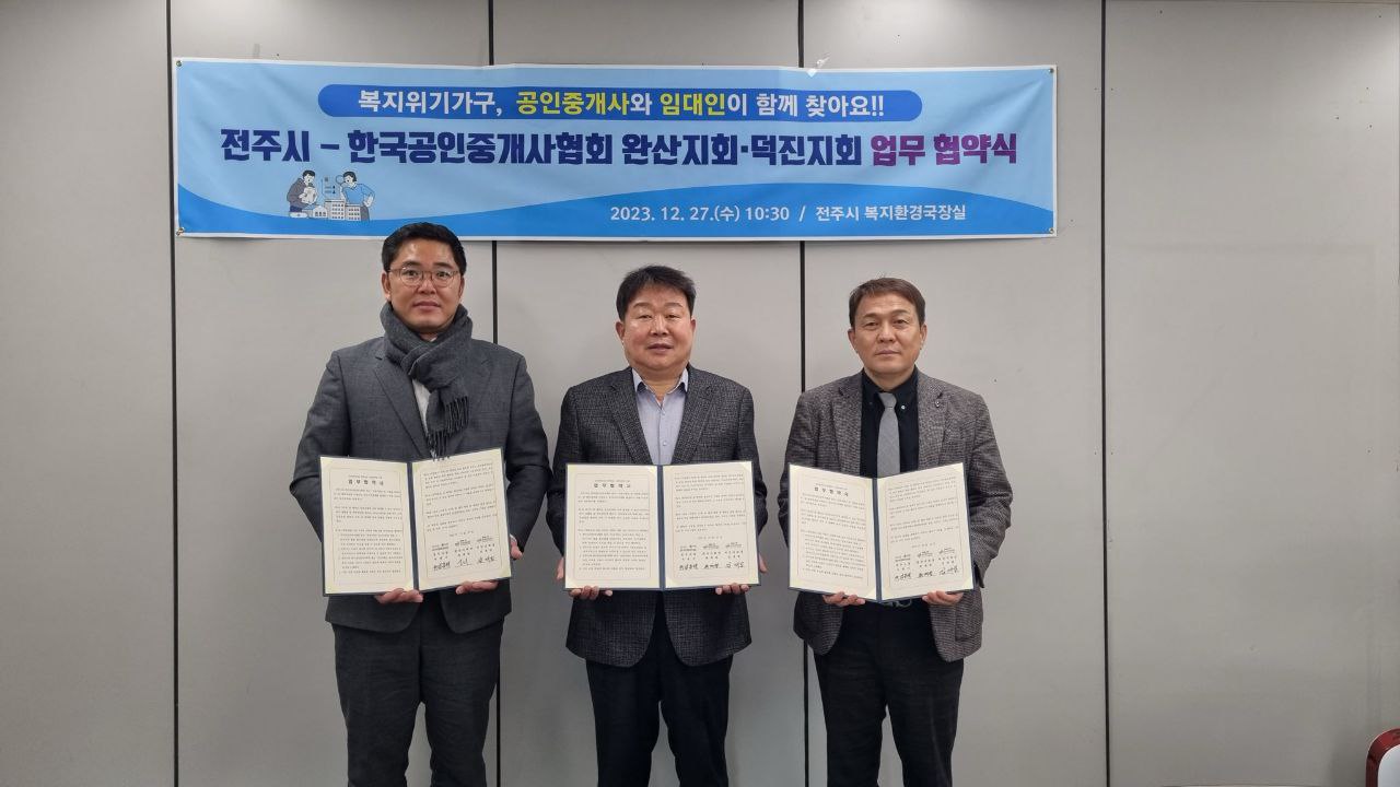 전주시는 27일 전주시 복지환경국장실에서 한국공인중개사협회 최재필완산지회장 김재범덕진지회장과 복지 사각지대 발굴을 위한 업무협약을 체결했다.