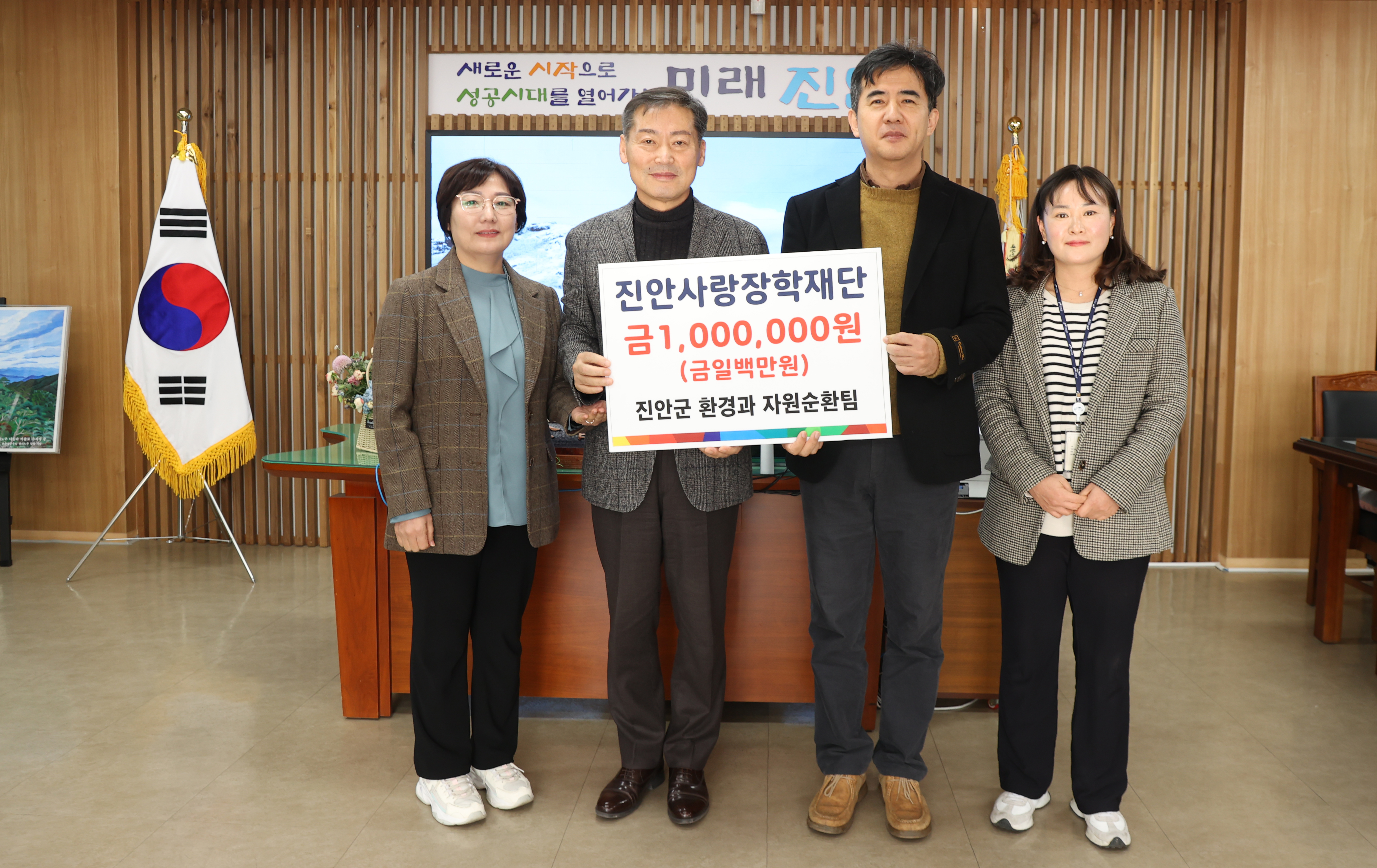 [진안=뉴전북]진안군 환경과 자원순환팀이 5일 진안사랑장학재단(이사장 전춘성)에 장학금 1백만원을 기탁했다.