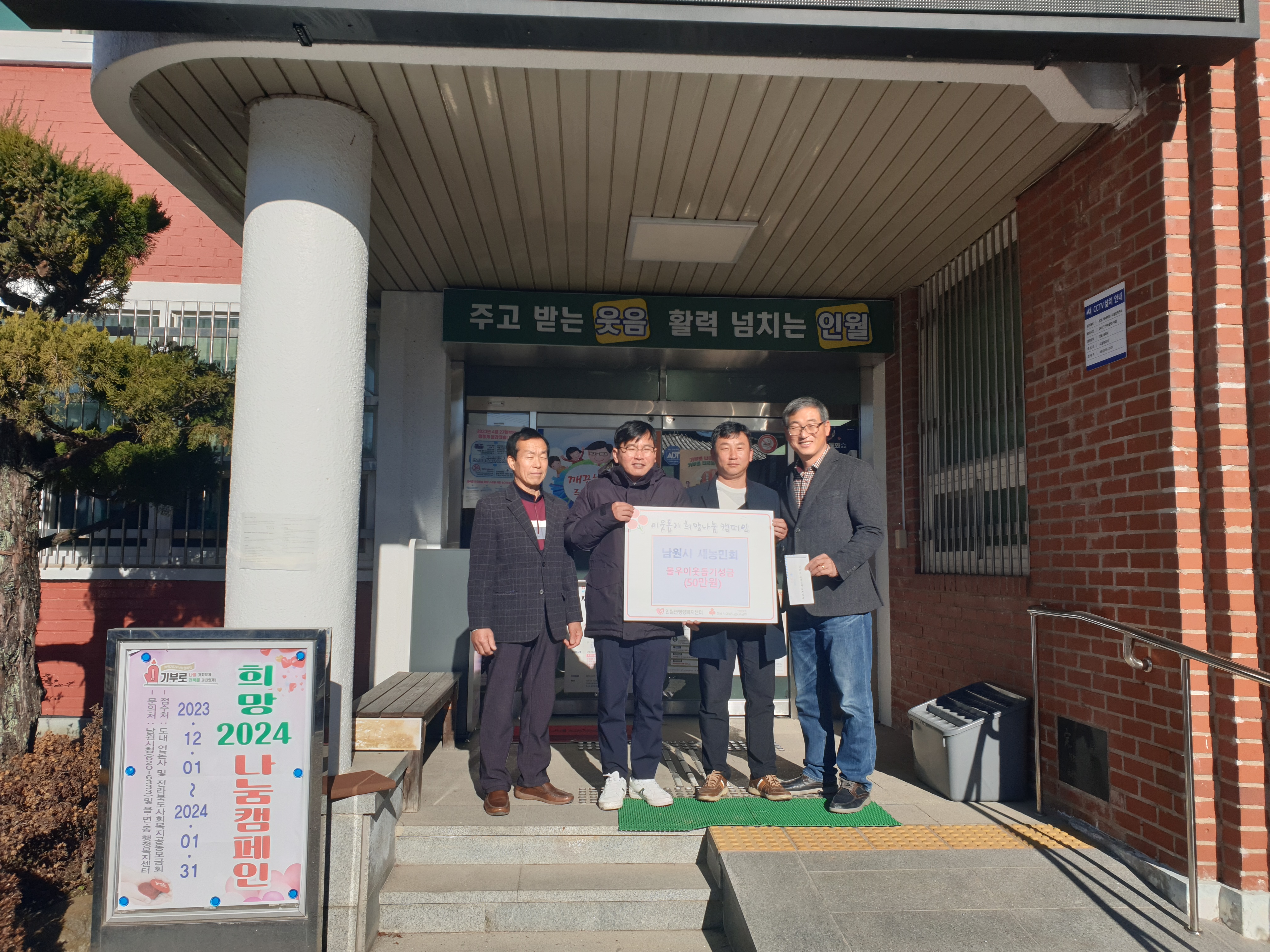남원시 새농민회 장영두 회장을 비롯한 회원들은 새해를 맞이하여 「희망 2024 나눔캠페인」에 동참할 수 있게 되어 더없이 뜻깊게 생각한다며 어려운 이웃들에게 작으나마 희망이 되고 도움이 되었으면 좋겠다는 생각에 기부를 실천하게 되었다”고 전했다.