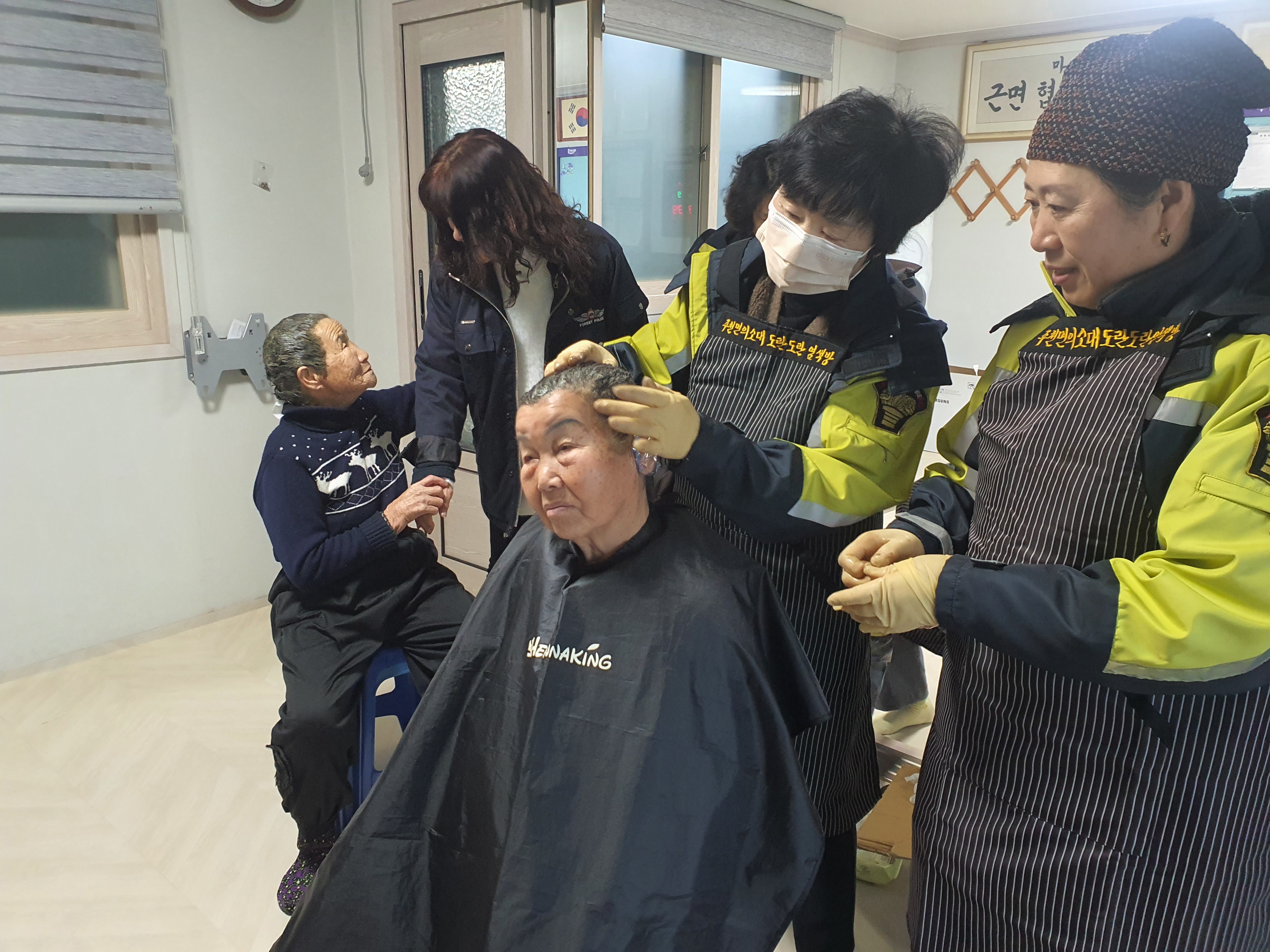 주천면 각 마을을 찾아가 여성 의용소방대에서는 염색을, 남성 의용소방대에서는 취약계층에게 고효율 엘이디(LED 등 교체, 노후 전기선 정리, 고장난 문 경첩 수리 등으로 생활 속 불편 사항을 해결해드렸다.