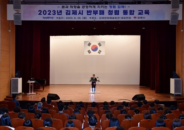 앞서 언급한 청렴 문화·제도 구축을 위한 노력과 함께 공직자 개개인의 청렴 수준을 향상시키기 위해 ‘부패방지 청렴교육 의무이수제’를 운영했다. 반부패 관련 법령 및 제도에 대한 이해도 제고와 부패 통제 능력 배양을 목표로 전 직원 대상 반부패 청렴 통합교육, 고위공직자·신규 임용자·승진자 대상 청렴 및 행동강령 교육, 상시 자가학습, 청렴골든벨 등 청렴교육을 실시했다. 이를 통해 시는 국민권익위원회의 교육정책에 전략적으로 대응하고, 전 직원이 청렴 의무이수 시간을 충족해 부패방지 교육을 성실히 이행하며 청렴으로 멋진 김제 人을 양성했다.