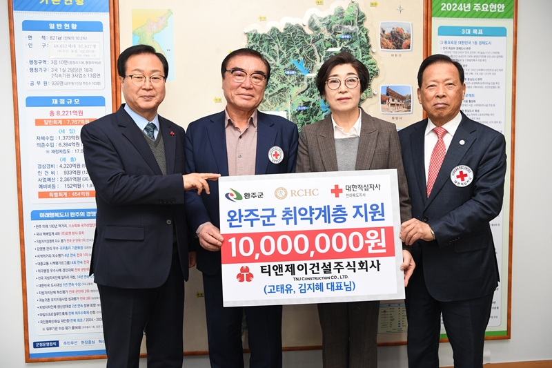 유희태 완주군수는 “어려운 이웃을 위해 나눔을 실천하는 ㈜티앤제이건설에 감사하다”며 “따뜻한 마음을 담아 관내 어려운 이웃들에게 소중하게 전달하겠다”고 감사 인사를 전했다.