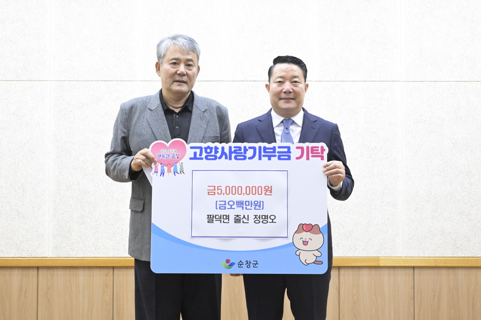 [순창=뉴전북] 전북 순창군은 5일 순창 출신 기업인 정명오 씨가 고향사랑기부금 개인 최고액인 500만 원을 기탁했다고 밝혔다.