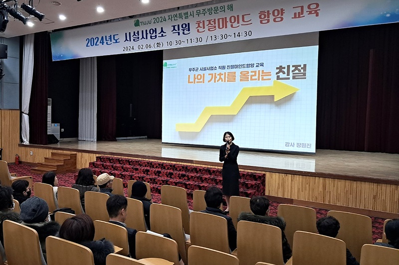 [무주=뉴전북] 무주군이 ‘자연특별시 무주방문의 해’의 성공적 추진을 위해 반디랜드와 국민체육센터, 예체문화관, 공예문화촌 등 무주군 대표 문화·예술·체육시설들을 아우르는 시설사업소의 직원 88명을 대상으로 친절 교육을 진행해 눈길을 끌었다.