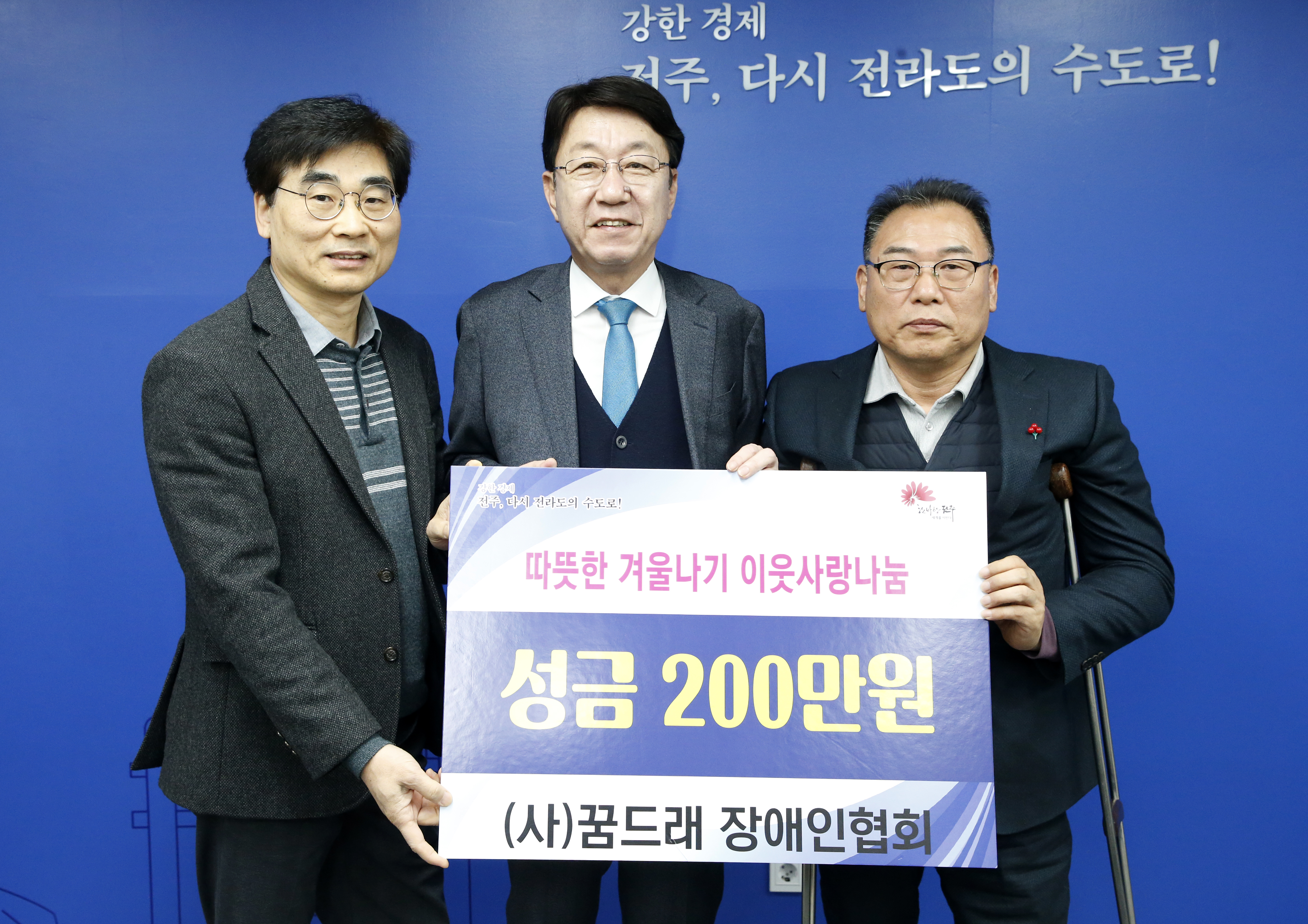 [사회=뉴전북] )꿈드래장애인협회(회장 하태복)13일 전주시청을 찾아 설 명절을 맞아 이웃사랑 나눔을 실천하기 위한 성금 200만 원을 기탁했다.