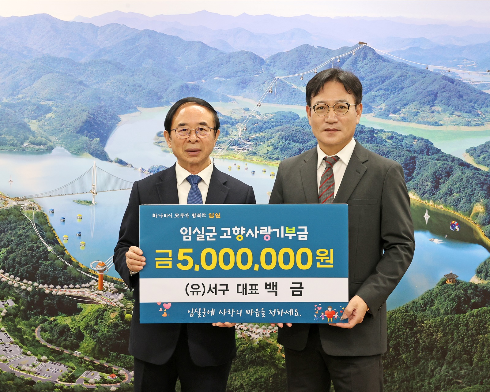 [임실=뉴전북] 전북 임실군에 고향사랑기부제 고액 기부가 계속되고 있다. 지난 7일에 지사면 번영회 변현섭 총무의 아들인 변재승 씨가 5백만 원을 기탁한 데 이어, 14일에는 (유) 서구 백 금 대표가 5백만 원을 기탁했다.