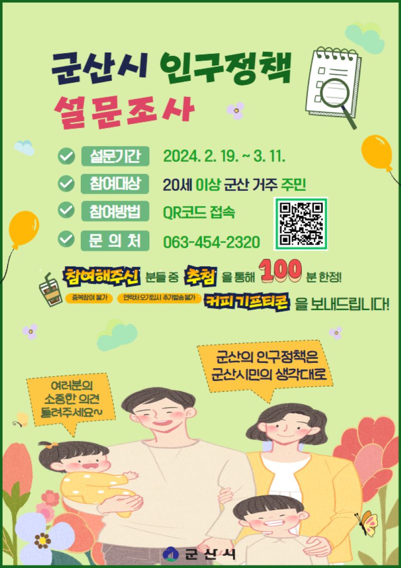 [군산=뉴전북] 군산시는 오는 3월 11일까지 20세 이상 군산에 거주하는 군산시민 및 단기 거주자를 대상으로 저출생․고령화 문제에 대한 시민 인식과 정책 수요를 파악하고자 인구정책 설문조사를 실시한다고 밝혔다.