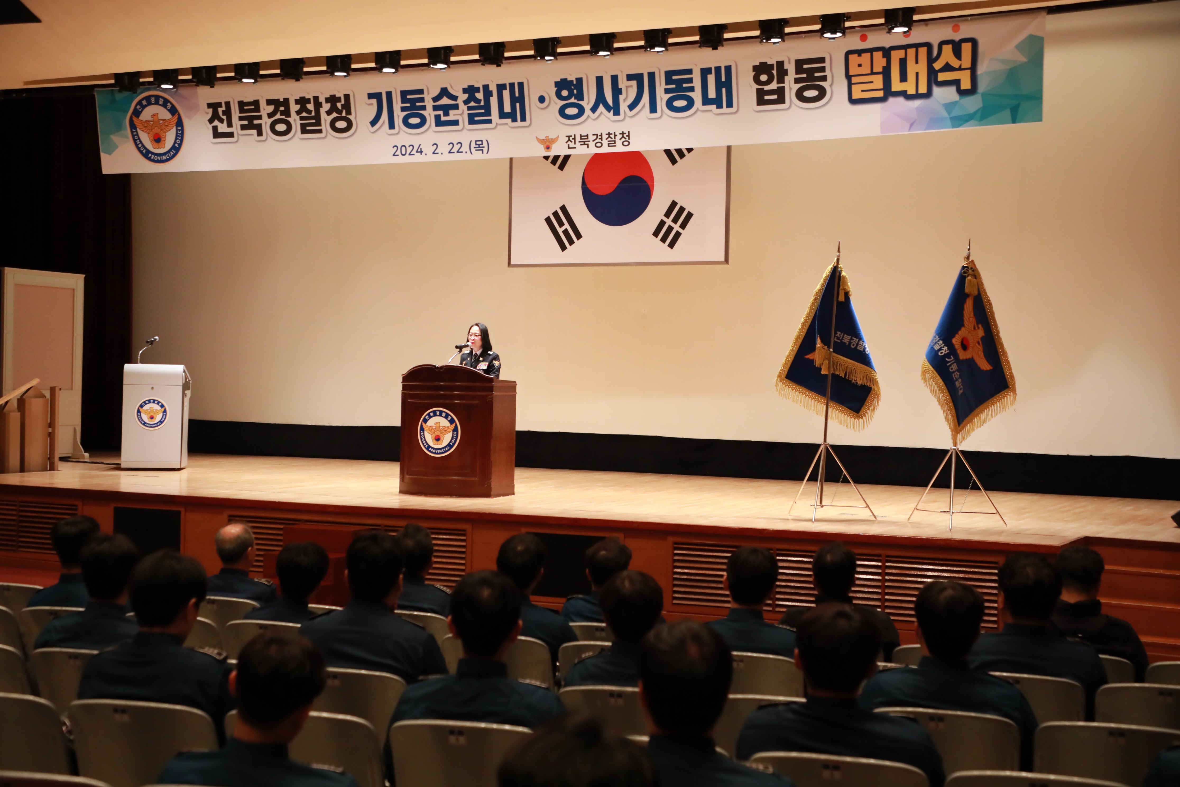 [시회=뉴전북] 전북경찰청(청장 임병숙)은 지난 22일 본청 온고을 홀에서 ‘기동순찰대·형사기동대 합동 발대식’을 개최했다.