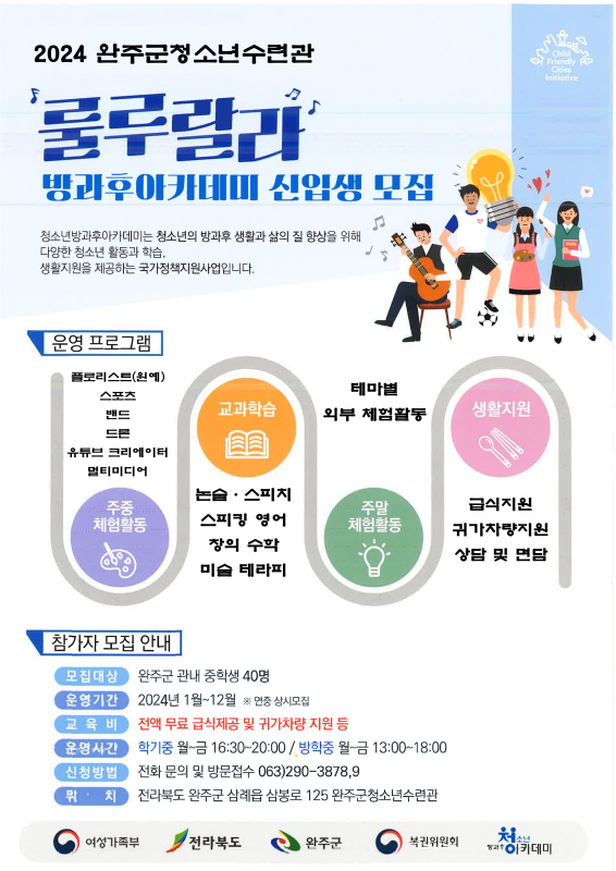 [완주=뉴전북] 완주군청소년수련관이 관내 중학교 1~3학년을 대상으로 ‘2024년 방과후아카데미’ 신입생을 모집한다.