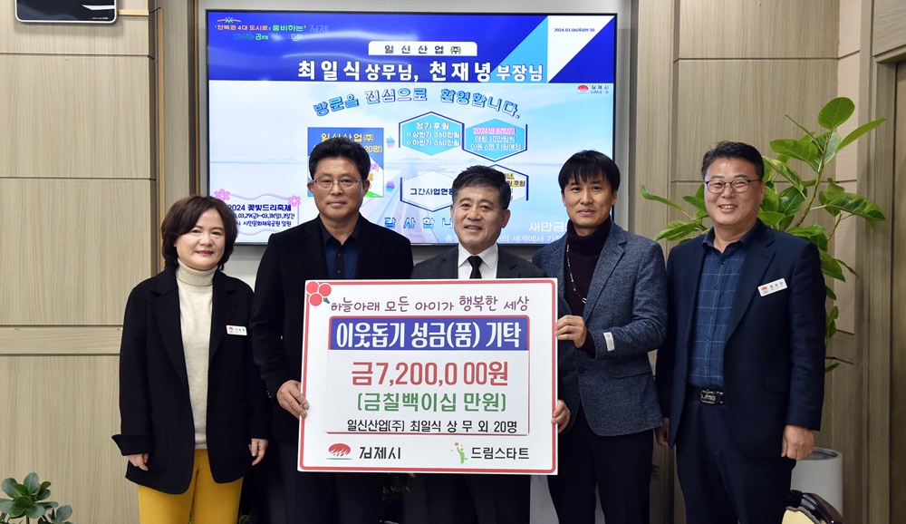 [경제=뉴전북] 김제시(시장 정성주)는 일신산업㈜(상무 최일식)이 6일 드림스타트 아동들을 위해 써달라며 720만원을 기탁했다고 밝혔다.