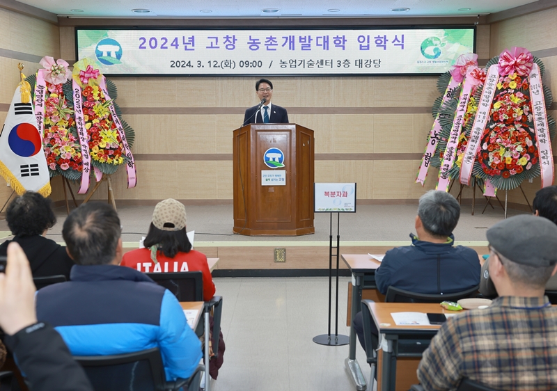 [고창=뉴전북] 고창군이 12일 미래농업을 선도하는 전문농업인 육성을 위해 운영하는 농촌개발대학 신입생 입학식을 열었다.