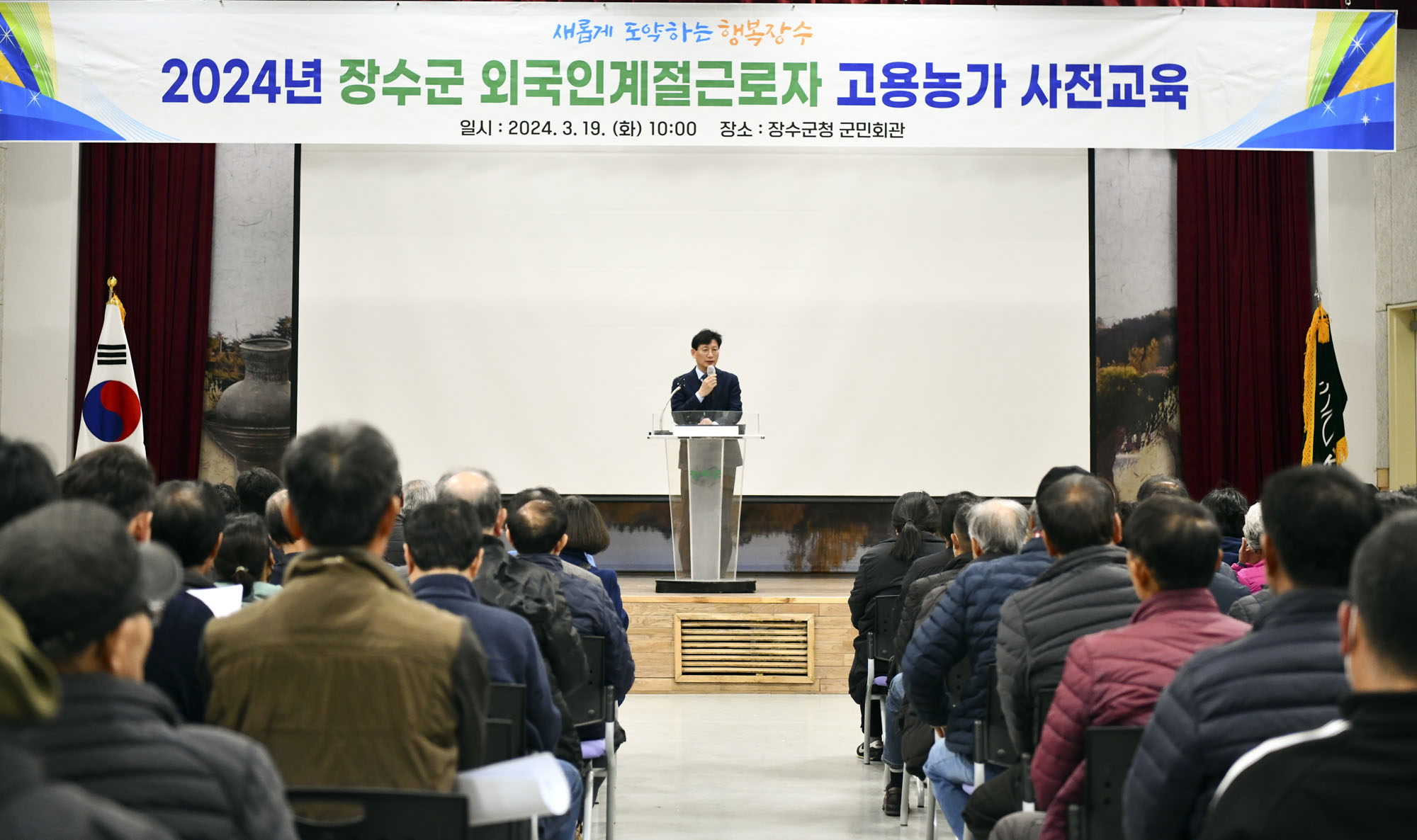 [장수=뉴전북]장수군은 지난 19일 군민회관에서 2024년도 외국인 계절근로자 고용농가 106명을 대상으로 사전 교육을 실시했다.