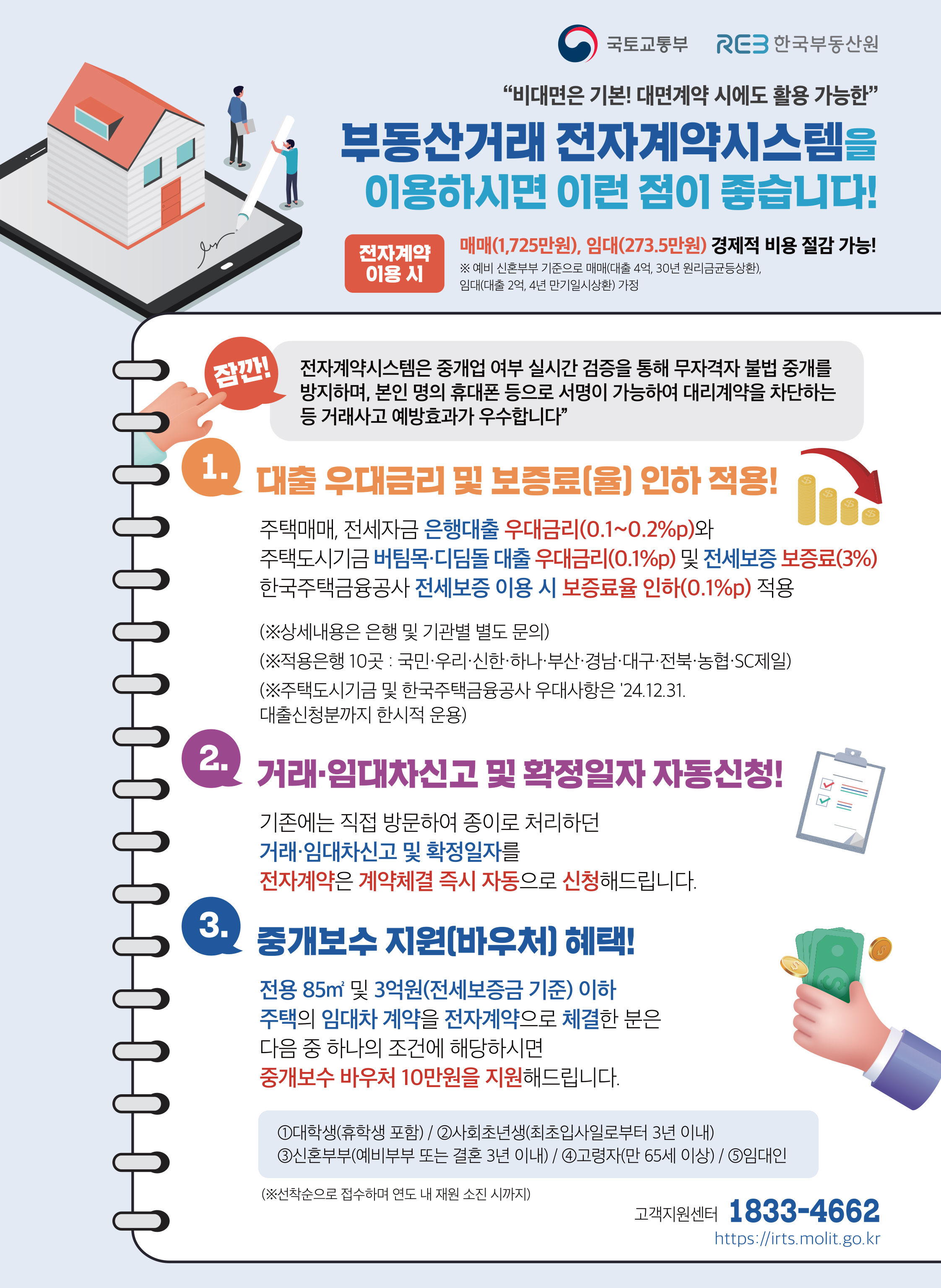 또한, 부동산 전자계약으로 계약을 하는 경우, 주택 매매·전세자금 대출의 우대금리 적용(최대 -0.2%p), 부동산 거래신고 및 임대차신고·확정일자 자동신청, 중개보수 바우처 지원(`24년 3월 현재 조기종료) 등 다양한 혜택을 받을 수 있다.