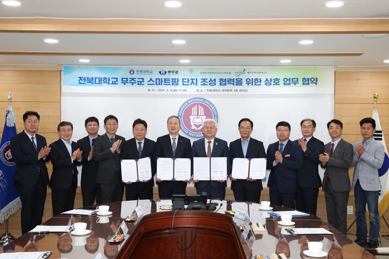 [무주=뉴전북] 무주군이 임대형 스마트팜 사업을 본격화하고 나섰다. 무주군은 지난 9일 전북대학교(총장 양오봉)를 비롯한 농업회사법인 ㈜무주스마트팜(대표 장운합), 에이치와이엔이(주)(대표 임종덕)와 상호협력을 위한 업무협약을 체결했으며 이를 기반으로 현재 무풍면 애플스토리 테마공원 내에서 추진 중인 임대형 스마트팜 사업 추진에 박차를 가할 방침이다. 무주군은 2026년까지 6.1ha부지에 4.3ha 규모의 온실을 구축하고 이를 여름딸기 재배 기반으로 삼을 계획이다.