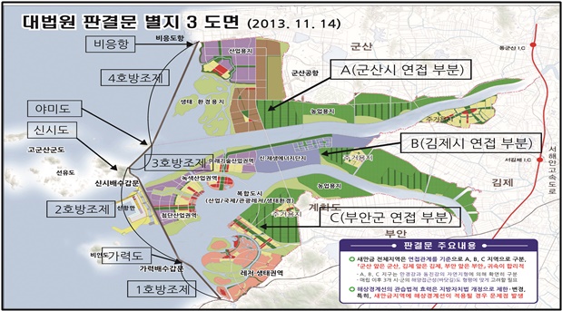 하지만 최종적으로 1호 방조제는 부안군, 2호 방조제는 김제시, 3, 4호 방조제는 군산시로 정해졌고, 전체적 관할 구도로 만경강과 동진강 자연지형, 인공구조물의 위치와 연접관계에 따라 군산 앞은 군산, 김제 앞은 김제, 부안 앞은 부안 관할이 가장 합리적이라는 대법원 확정판결이 도출된 것이기에 향후 방조제 내․외측 매립지 관할결정에 더욱 의미를 갖게됐다고 할 수 있다.